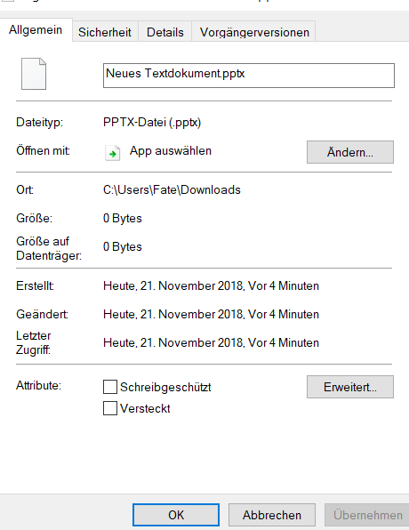 Bei Eigenschaften wird folgendes angezeigt: PPTX-Datei (.PPTX)