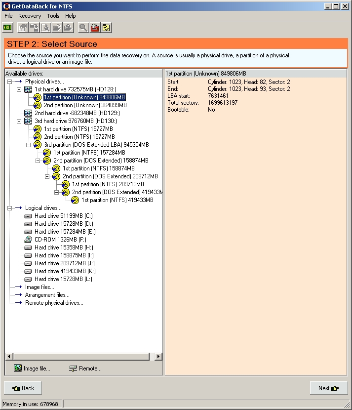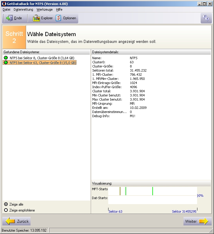 Dann habe ich mir angeguckt, was mit der Platte 1 los sein könnte. PartitionMagic 8 findet die gesamten
