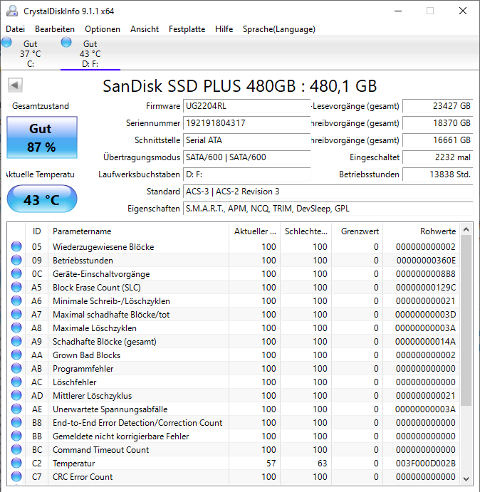 - HDD / SSD: 500GB Samsung 860 Evo / Sandisk 480gb SSD