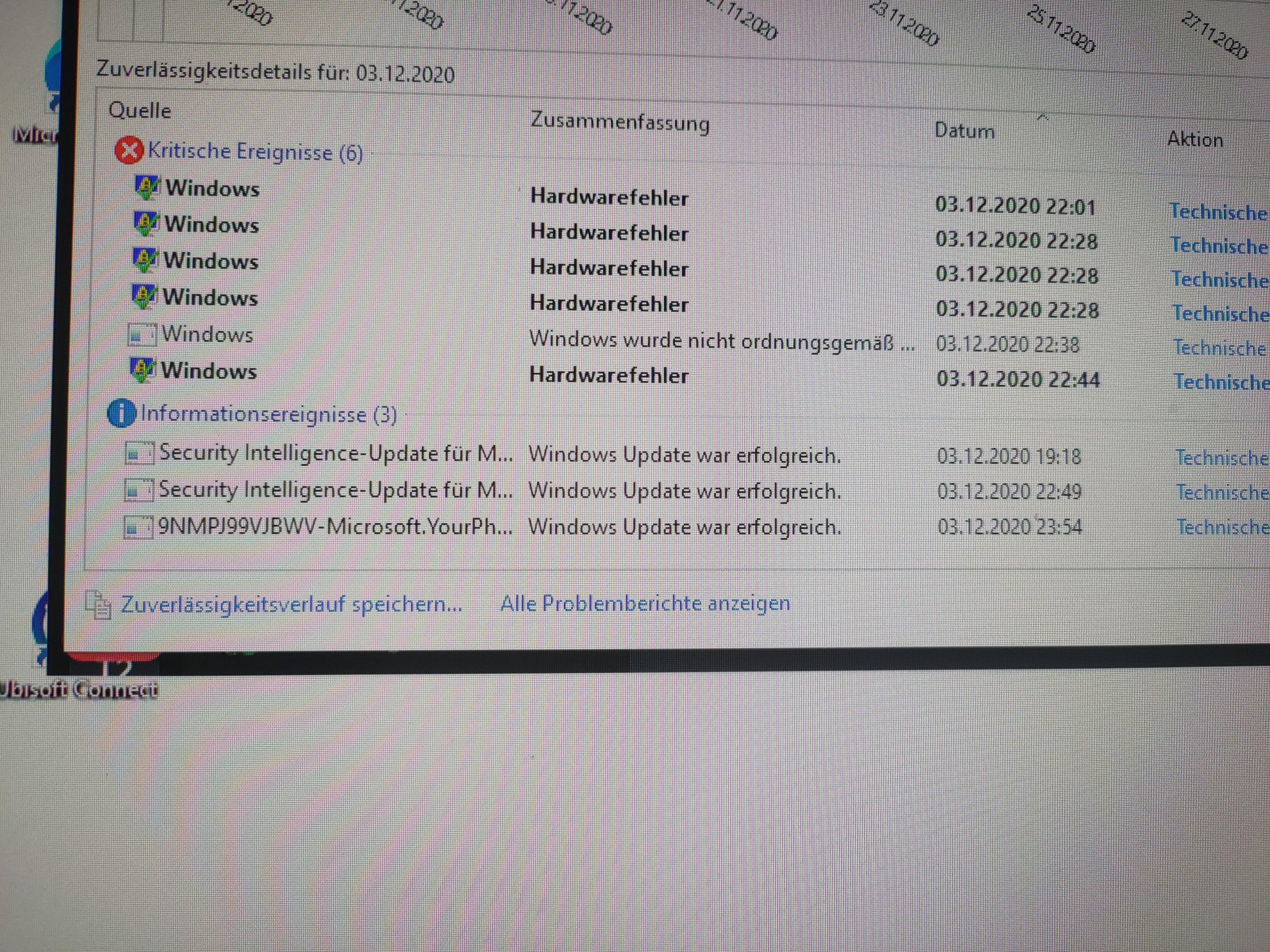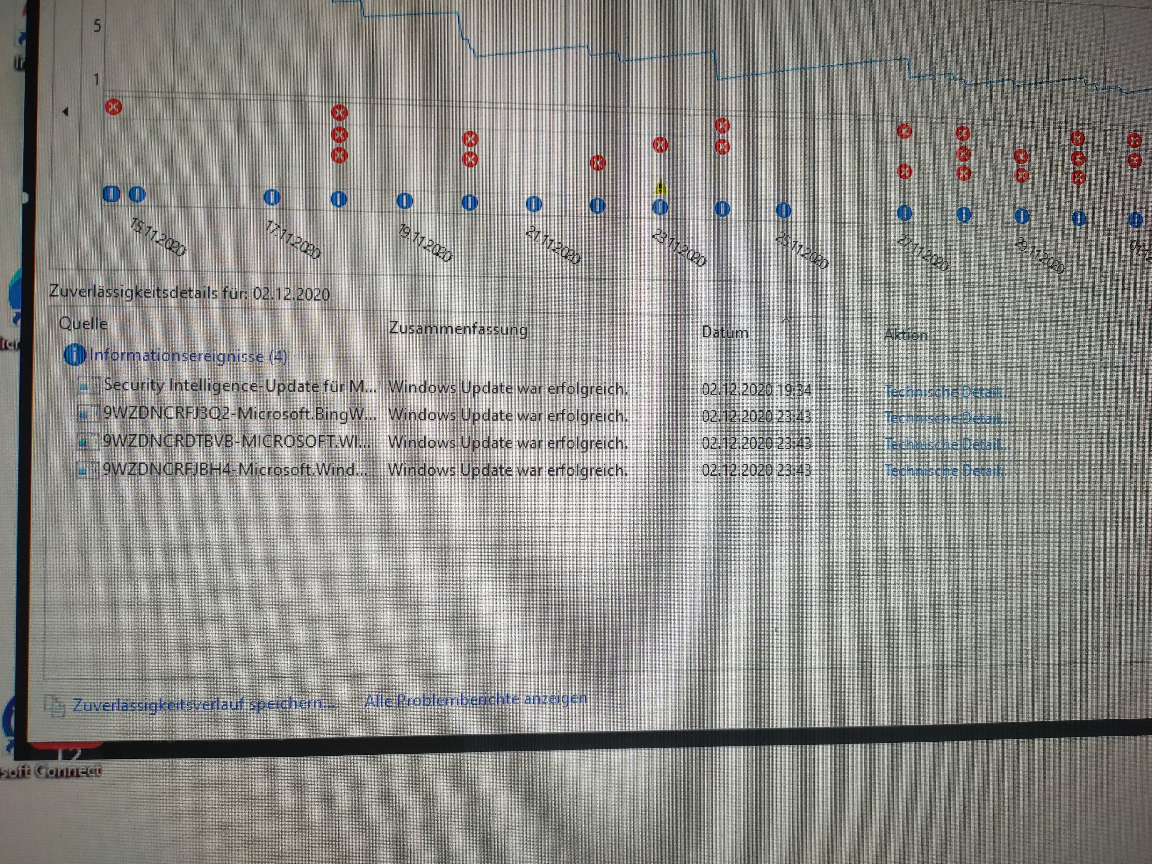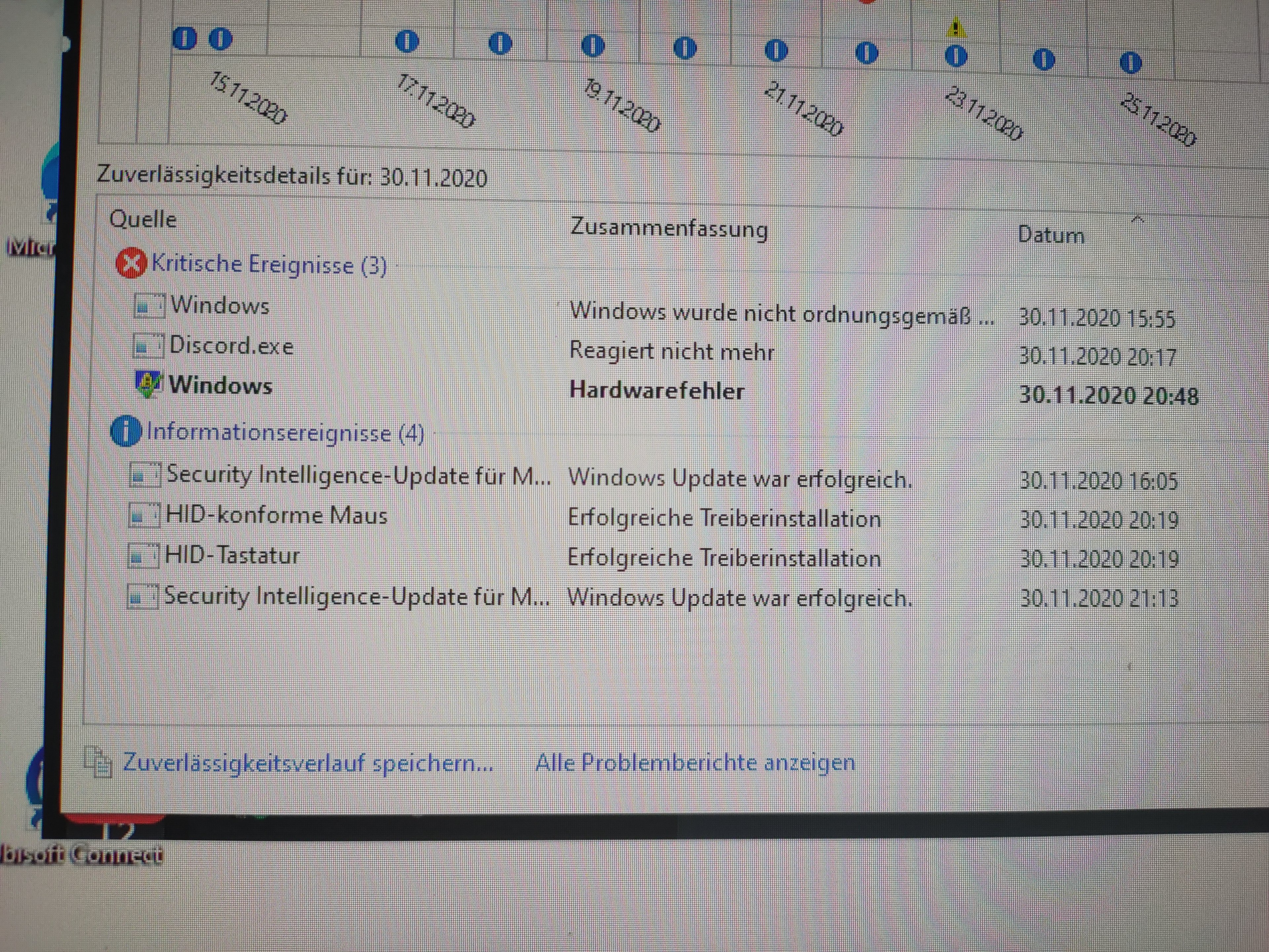 Scroll mal soweit es geht nach links im Zuverlaessigkeitsverlauf und schau wo die roten X angefangen haben