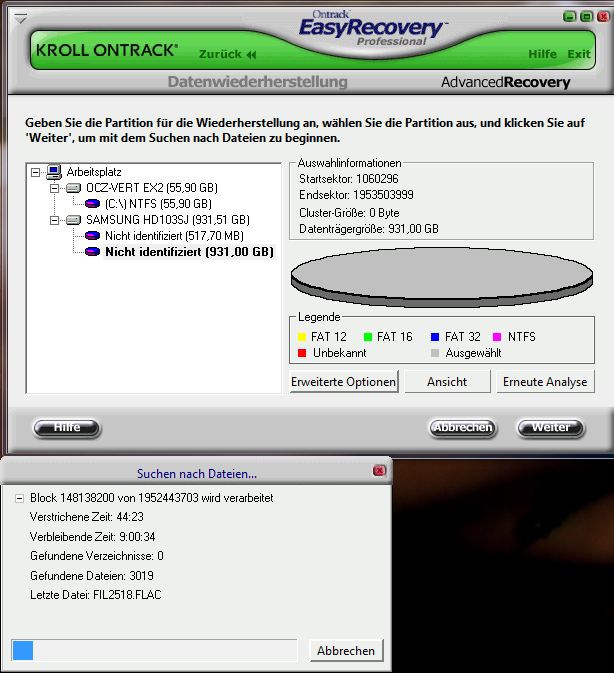 Ich habe nun also eine der 2 Platten genommen und ins QNAP geschoben, in der Hoffnung dass das nichts zerstört und dem Wissen, dass ich ja noch eine zweite Backup Platte habe. Also das QNAP hat natürlich alles gelöscht beim Initialisieren und ich dachte mir "lieber mal vorsichtig sein und Platte wieder raus nehmen und ein Backup von der Backup Platte machen und eine ganz neue ins QNAP. Tja... also Platte wieder ins RAID und siehe da: Festplatten werden nicht mehr erkannt. Webpam mag mich nicht mehr und Windows mag die Platte überhaupt nicht erkennen. Also zum anderen PC; Platte direkt angehängt. Nun mit PCI File Recovery alles durchlaufen lassen. Der findet viel, aber die Dateien heissen circa so wie wenn man den ASCII Code durch die Lotto-Mischmaschine jagt: )("/§*_*Ü@Ú1☺56£185☺ oder so ähnlich.... So kann ich natürlich nichts mit den Daten anfangen. Ontrack Easy Recovery sagt ist momentan bei 2900 Dateien die es gefunden hat, zb die aktuelle ist 2412.FLAC. Ich nehme an das ist eine meiner vielen FLAC Dateien. Einige tausende waren das ja ... aber ... aber ... habe ich eine Chance da wieder an die Dateien ranzukommen wie sie waren? Die Sache war die, dass ich die alle feinstordentlich sortiert hatte, mit Fotos, Livevideos dabei, Albumbild, Backcover... da steckt viel Arbeit drin.