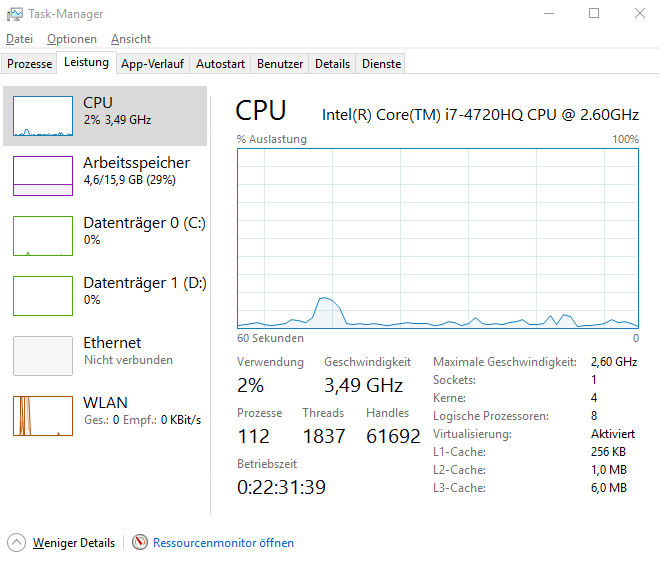 1. Wenn mein Laptop im „Leerlauf“ (CPU: 1 - 2 %) ist, steht unter „Geschwindigkeit“ im Taskmanager ca. 3,5 GHz (Siehe Bild 1).