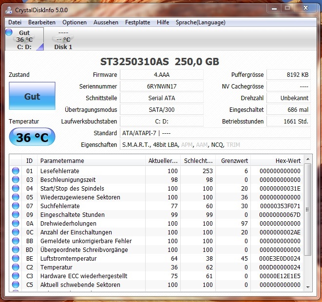 Ein Bekannter meinte, dass die Festplatte vielleicht einen Sprung hat. Ich hab mit SeaTools alle Tests durchgeführt und auch mal Crystaldiskinfo laufen lassen, alles ohne Erfolg. Laut SeaTools treten keine Fehler auf, und Crystaldiskinfo zeigt beim Status "Gut" an. Ich kann allerdings mal die Daten schicken, die das Programm ausliest, falls das hilft.