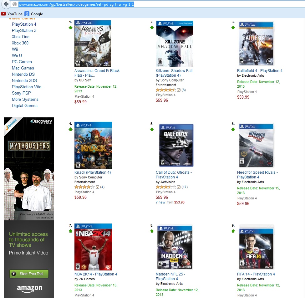 Nachdem schon amazon.de eine "Buy two, get one free" (B2G1) für Vorbesteller der PS4 am Start hat, zieht nun Amazon USA nach. Das Ergebnis dieser Aktion ist eklatant (aber natürlich nur eine Momentaufnahme). Zum besseren Verständnis: Das ist die Chart der gesamten Videospielessektion, nicht nur die der PS4!