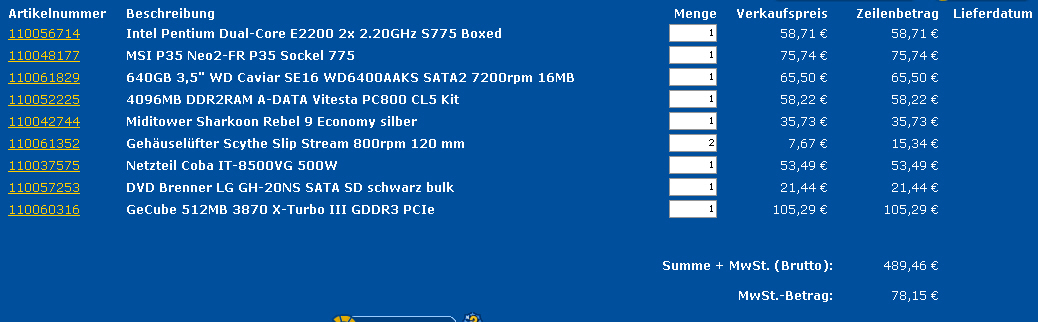 Hallo zusammen. Da ich meinen Athlon XP so langsam in Rente schicken wollte habe ich mir mal einen Rechner zusammengestellt. Ich brauche einen Rechner für Office+Internet und gelegentlich auch mal das eine oder andere Spiel. Der Rechner sollte insgesamt auch leise sein.