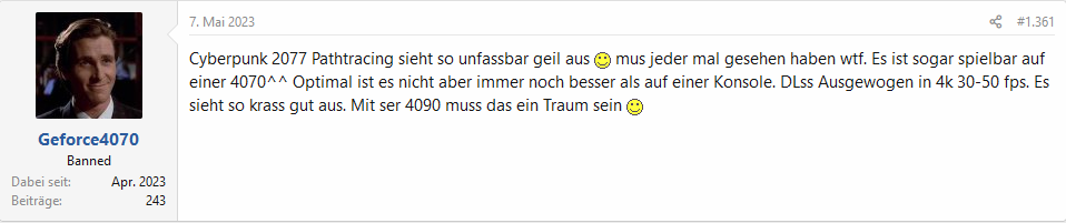 Habe aber in Erinnerung, dass in der Wüste ruckelig war. Evtl hatte ich damals auch alles max out zum testen mit AFMF gehabt. Wie auch immer, so toll ray tracing und upscaling in Exodus ist, so schlecht ist dessen Ton. Der einem alles versaut.