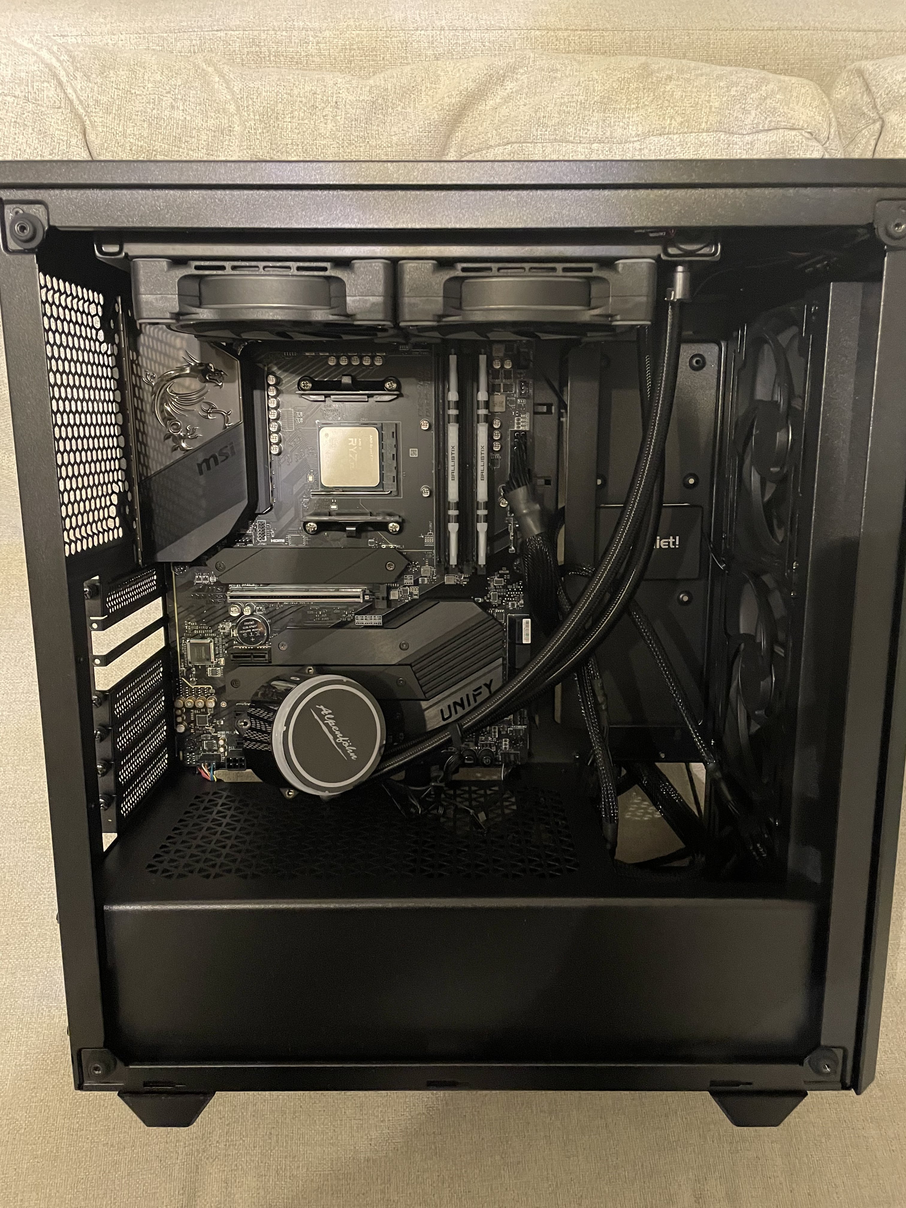 So sieht der aktuelle Stand aus. Ist das soweit richtig? Auf dem Deckel habe ich die Fläche, welcher vom Radiator nicht abgedeckt wird, rot markiert. Soll das so sein? Hinten schauen noch die 4 Kabel raus, die noch an irgendwelchen RGB Anschlüssen angeschlossen werden müssen.