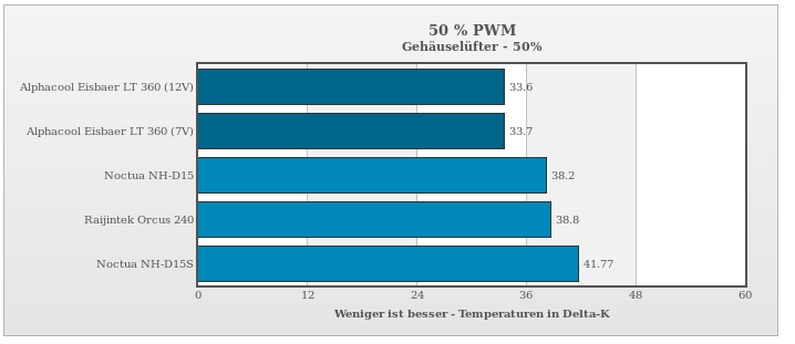 Im dargestellten Diagramm kühlt die LT360 bei einer Lüfterdrehzahl von 800 U/min zwar um 4-5°C besser als der NH-D15, dafür ist der NH-D15 durch die deutlich leiseren Lüfter unauffälliger. Du kannst bei der LT360 also 30€ für neue Lüfter einplanen.