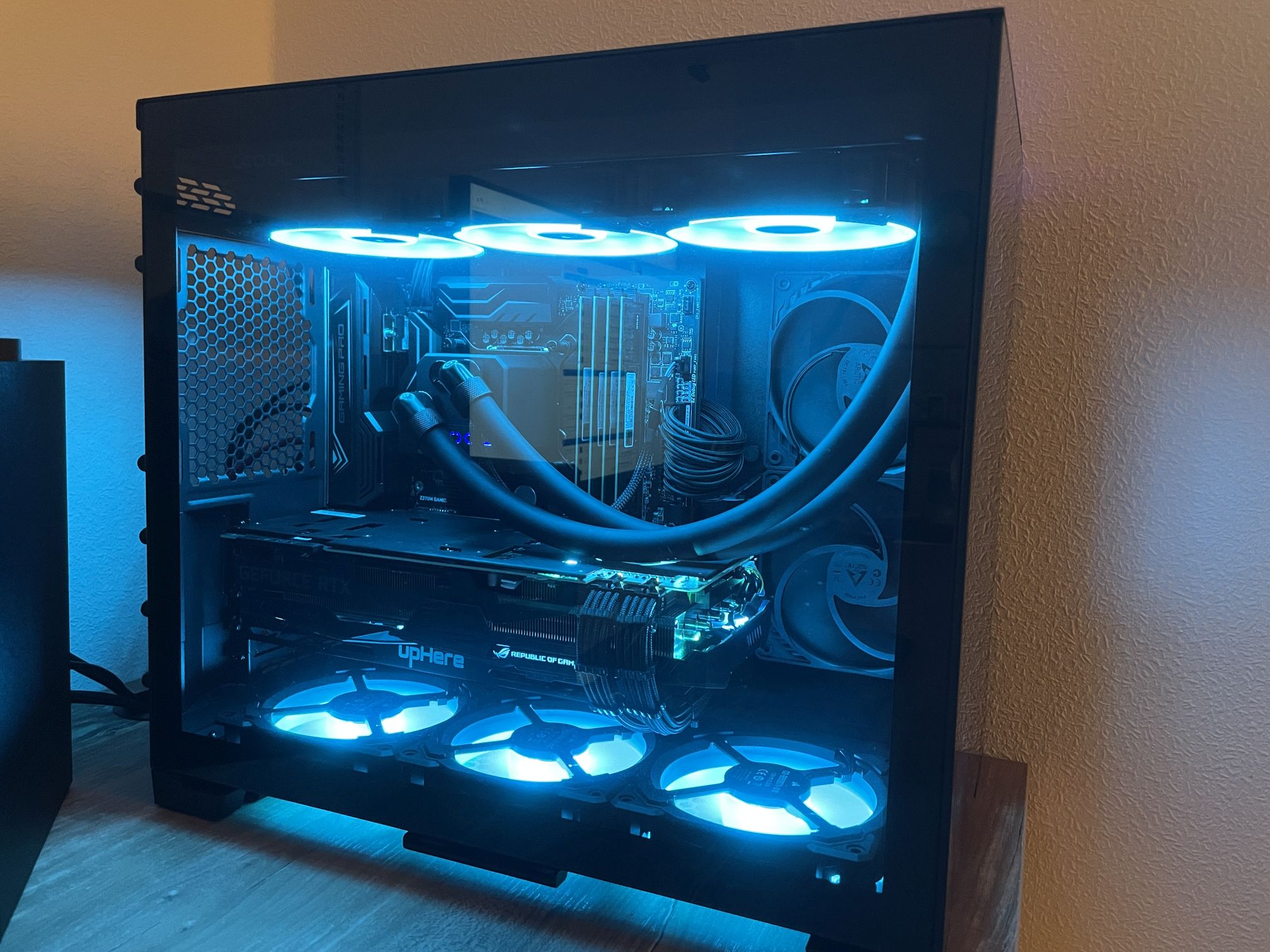 Hab jetzt auf mATX und Eisbaer AiO umgebaut. Hab sie mit 10V laufen und kann sie nicht raushören. Das Reservoir ist super praktisch zum entlüften und es ist nur eine ganz kleine Luftblase drin. Schläuche sind in 16/10 von EK, der Rest ist Alphacool. Bei Pubg lande ich zwischen 57° bis 60°C und bei Cyberpunk pendelt es sich bei 65°C ein.