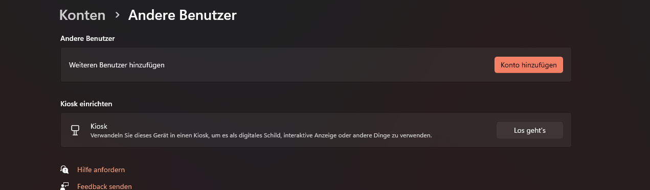 Nein, es ist ja das Menü "andere Benutzer" und nicht etwa "aktueller Benutzer". Auf deinem System existiert aktuell kein anderer Benutzer.brody67 schrieb:Aber es müsste bei mir doch diese Option mit meinem Benutzernamen verfügbar sein, oder?
