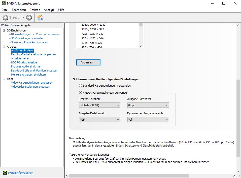 Hatte ich gestern Nacht noch entdeckt (war schon zu sehr an AMD gewöhnt, übersehen), da muss man in der Nvidia Systemsteurung bei "Auflösung" erst runterscrollen...total übersehen!