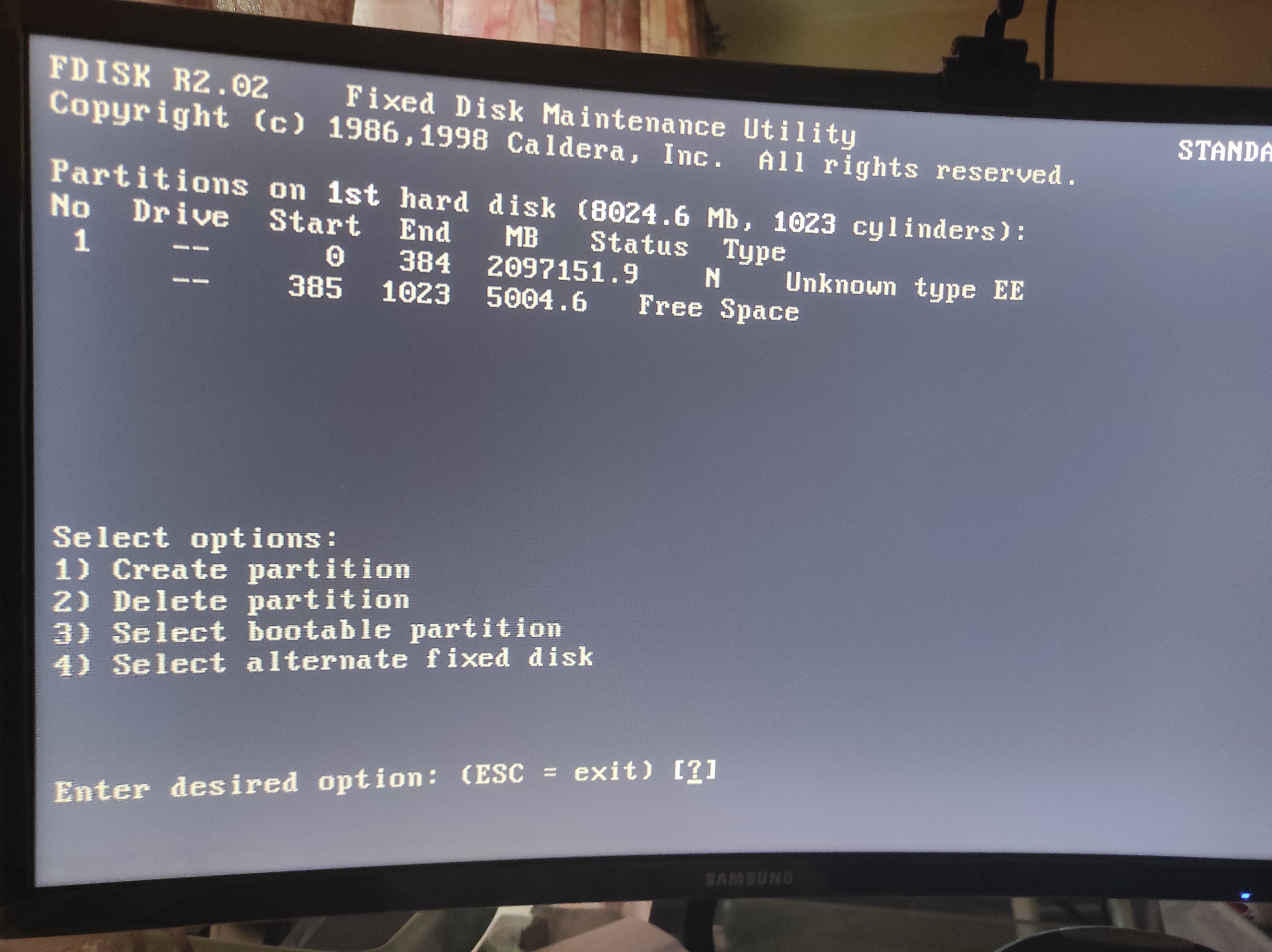 Die Partition ist 2MB Megabyte groß. Eine CD immerhin 768 oder so. Es gibt also eine tote Partition die unter WIN nicht erreichbar sein will (kenne ich; Ventoy parkt sich ja ›hinten‹) und DOS’ FDISK macht bei wie viel ‹zu›, 8MB?