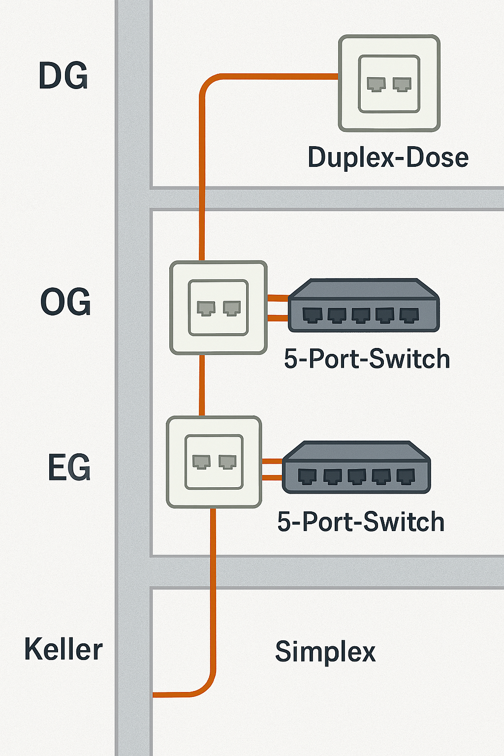 Gibt es Möglichkeiten z.B. ein Cat7 Kabel vom Keller durch eines der Leerrohre in einen Raum zu ziehen, dort eine Dose mit Port anzuschließen und von dieser Dose weiter zu gehen zur nächsten Dose? Wenn ja, welche Art Dosen benötige ich dann? Da die Leerrohre nicht sehr groß dimensioniert scheinen wird es vermutlich schwer, mehr als ein Duplex Kabel durch ein Leerrohre zu bekommen. Ich weiß, es fehlt irgendwie eine konkrete Fragestellung, aber ich dachte vielleicht stand hier schonmal jemand vor ähnlichen Problemen und hat 1-2 Ideen parat, da mir bisher hier im Forum immer sehr gut geholfen werden konnte.