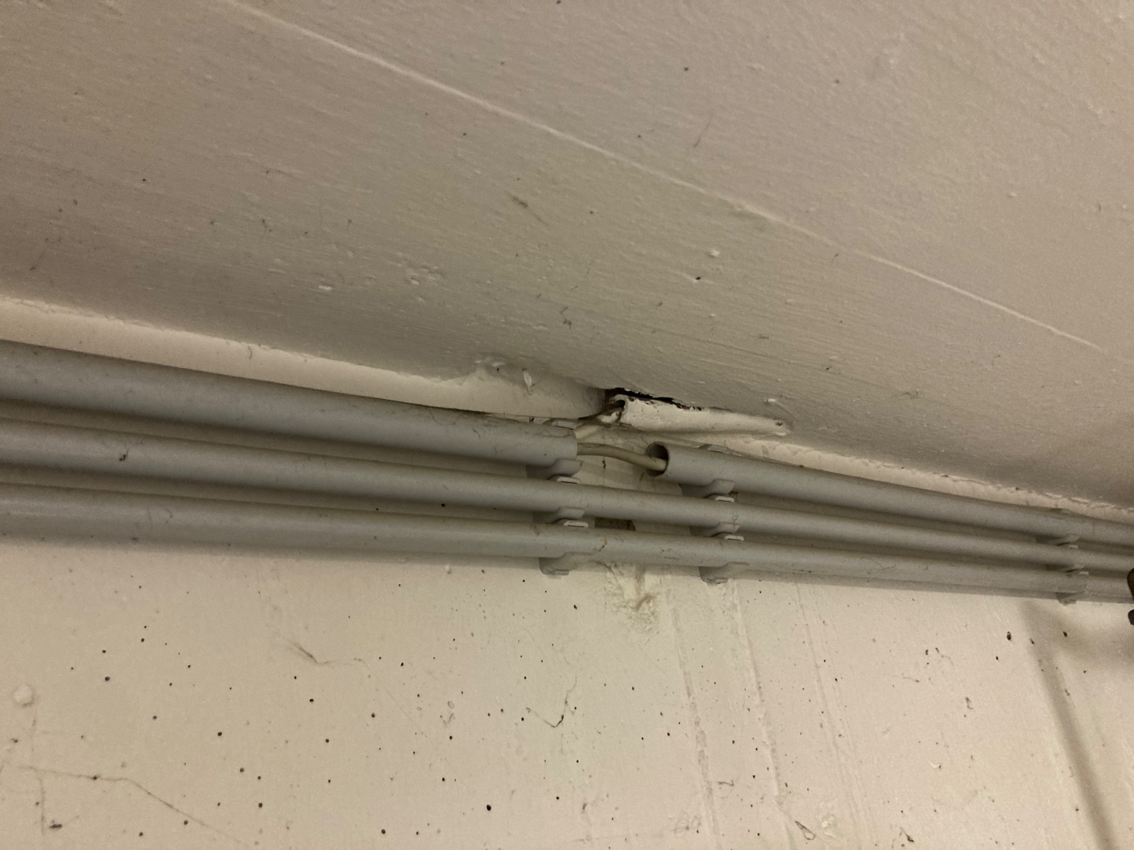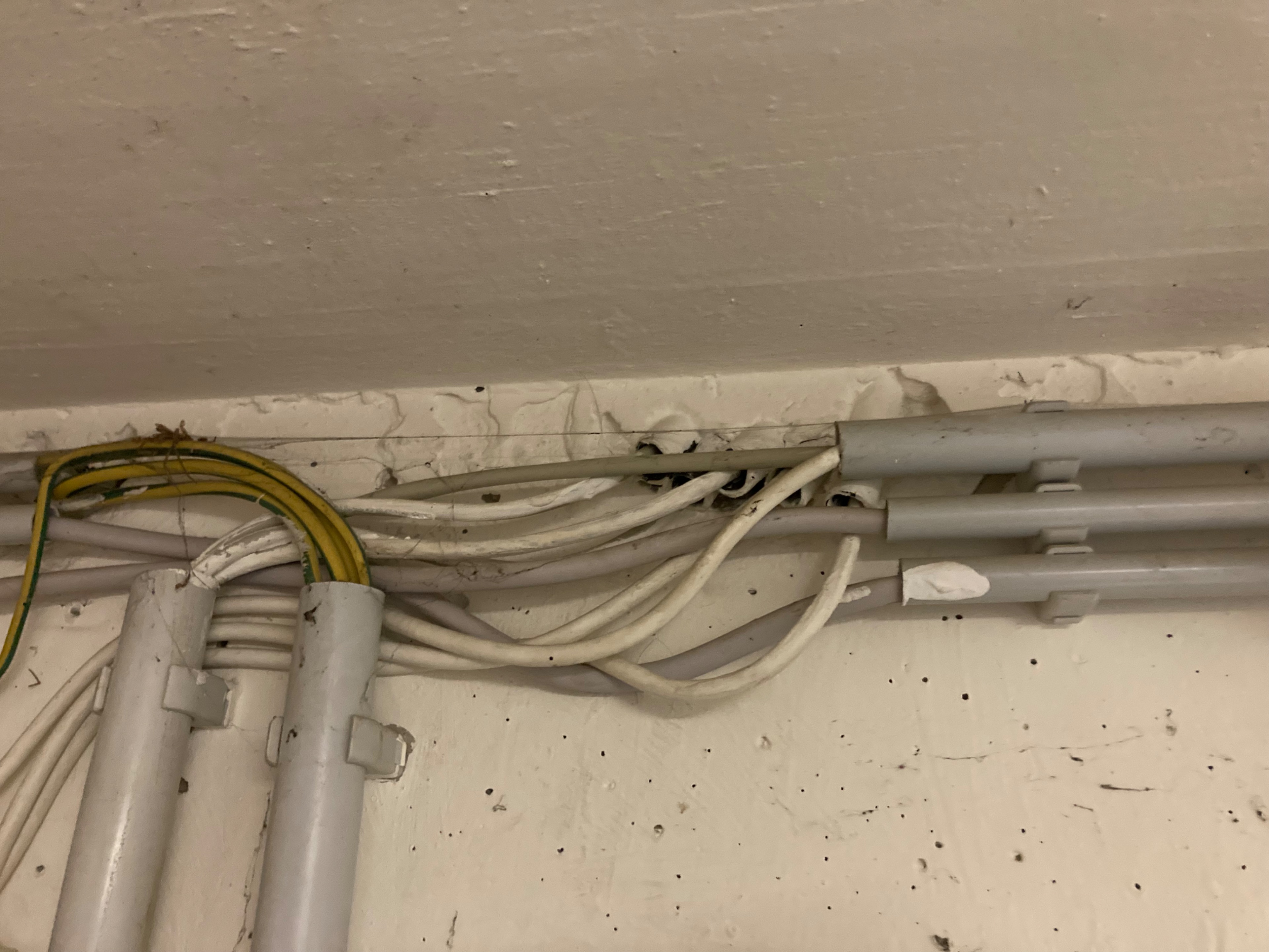 Nun kommen wir aber zum großen Problem: Das Haus ist 97 gebaut worden und besteht aus lauter Halbetagen, heißt die meisten Räume sind versetzt zueinander und es gibt keine durchgehende Wand, durch welche die Kabel geführt werden. Soweit ich das erkennen kann, gehen vom Hauptanschluss im Keller 3 Coax Kabel in Leerrohre (siehe Bild), welche sich dann irgendwie im Haus verteilen. Ich habe einige alte Bilder aus der Bauphase, dort ist aber mehr schlecht als recht drauf zu sehen, wo die Kabel genau langführen, nur in manchen Räumen ist der Laufweg klar auszumachen. Es scheint sich ausgehend von den 3 Coax Kabeln dann im Haus allerdings eine Art Baumstruktur zu entwickeln, wo die Kabel in einzelnen Dosen ankommen und von dort dann ein neues Kabel zur nächsten Dose weitergeht.