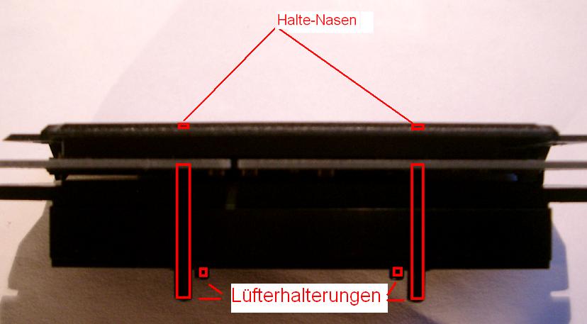 Irgendwann ist mir in den Sinn gekommen, dass Lüftertausch damals ja noch gar nicht in der Mode war. Dementsprechend sind bzw. waren die Halterungen auch gebaut: Einmal dran und gut.