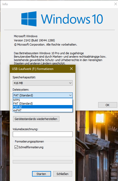 Du hast Probleme, das ist Standard, dass man mit Windows 10 auch FAT32 formatieren kann.