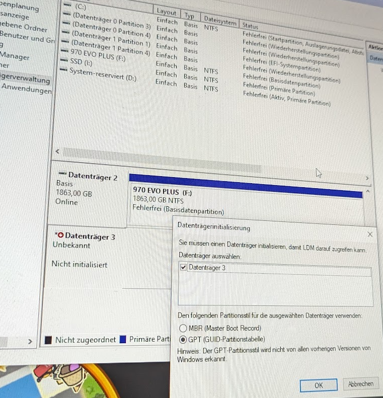 In der Datenträgerverwaltung sieht es so aus - angeschlossen über einen USB-Adapter: