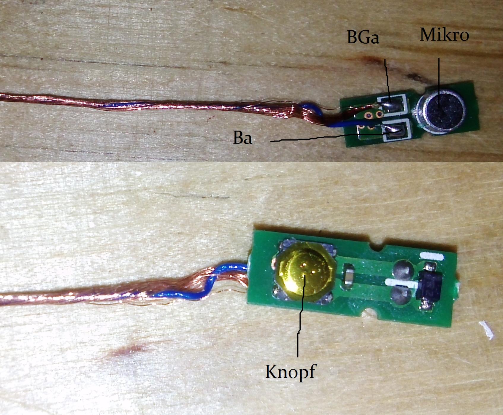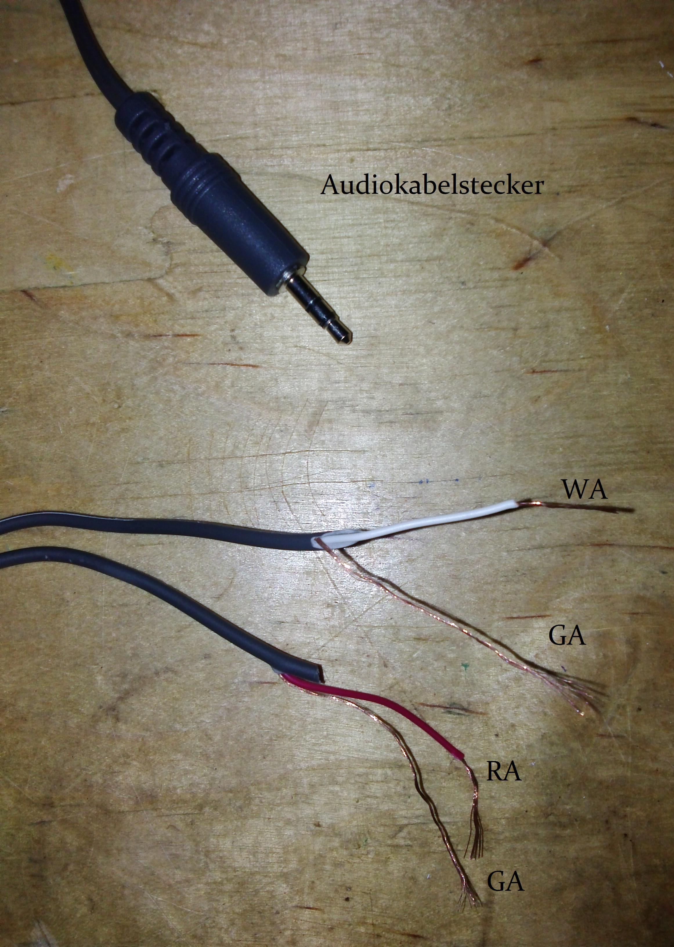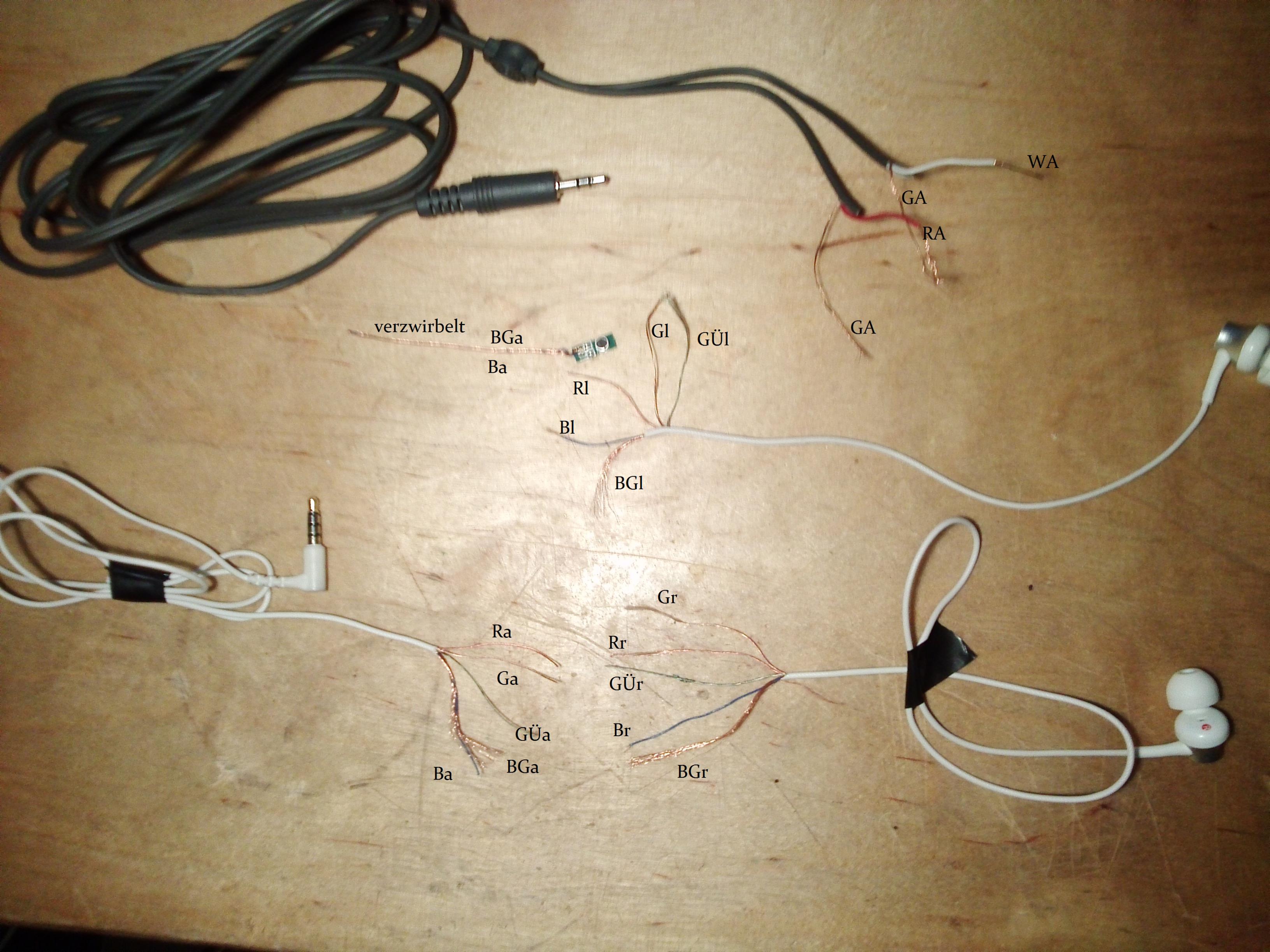 Mein ziel ist es, die Kopfhörer mit nem normalen Audiokabel (Links, Rechts, Masse) mit nem funktionierenden Klinkenstecker zu verlöten, jedoch bin ich etwas unbeholfen, was die Verdrahtung angeht. Im Folgenden poste ich ein paar Fotos und beschrifte diese.