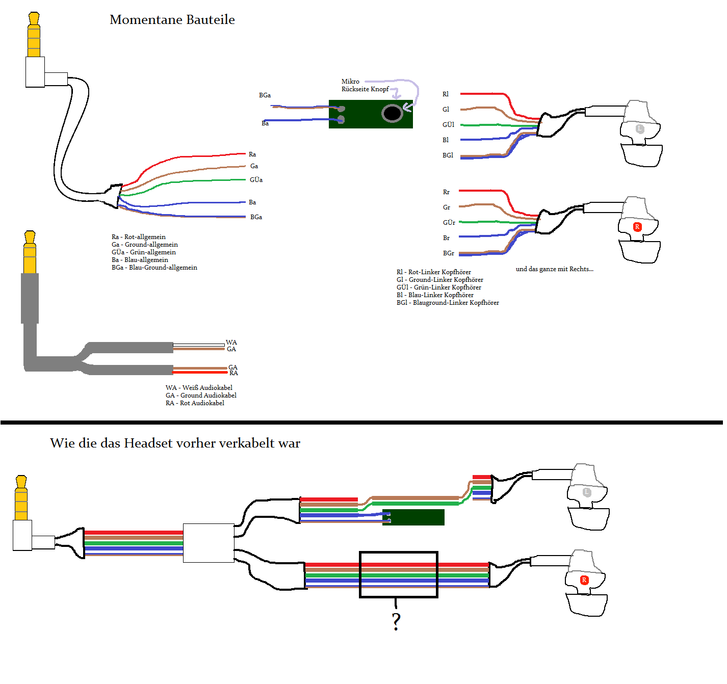 Wo jetzt wirklich mein Problem ist und wo ich hoffe, dass da einer Ahnung hat von der "Polung" von Handyheadsets, ob die Verdrahtung vom Knopf/Sender und dessen Leitung in direkter Verbindung mit den Lautsprechern steht. In der der Illustration ist vom Linken Kopfhörer zu sehen, dass dort Ra mit Rl nicht verbunden ist; das hab ich beim behutsamen aufschneiden der Kabel und Mikro/Knopf-Box festgestellt. Zusätzlich weiß ich nicht, ob die BGa und Ba mit dem Ga zu tun haben und ob diese vom Kopfhörer aus (BGr und BGl) irgendwie verbunden seinen müssen, damit es nen geschlossenen Kreis gibt.