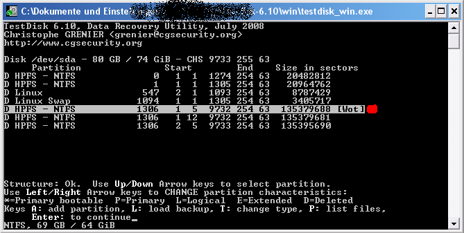 Es geht um die rot markierte Partition. Ich konnte per Testdisk mit dem "Copy"-Befehl schon die wichtigsten Daten auf die andere Partition kopieren. Leider reicht der Platz nicht für alle Dateien, da C: nur 10GB und D: knapp 65GB groß ist.