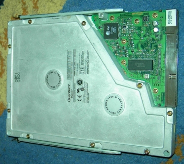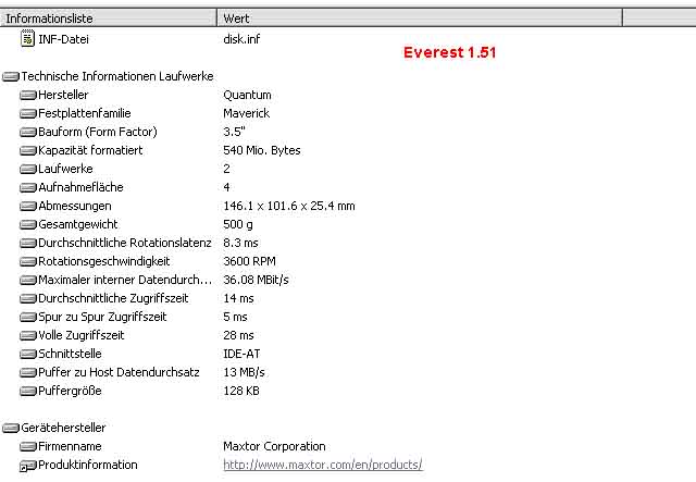 Die Festplatte ist über den Daumen gepeilt 11 Jahre alt und hat eine wahnsinnige Kapazität von 540MB! Die Platte dreht mit 3600RPM. Schnell das Teil entstaubt und mit einem 40-Adrigen IDE-Kabel an mein Mainboard angeschlossen: Festplatte läuft mit unruhiger Drehzahl an, und Volltreffer: Sie wird vom Bios erkannt.