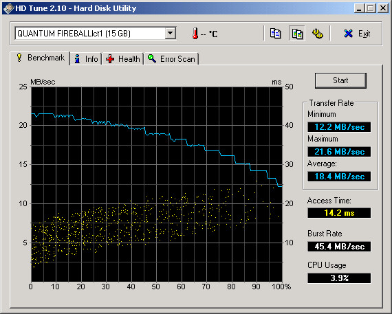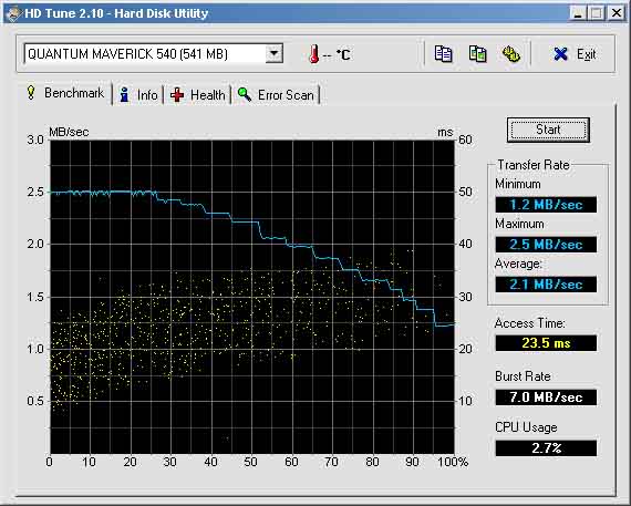 Bis Windows 2000 gestartet ist hat sich der gut hörbare Spindelmotor beruhigt und die nächste Überraschung kommt: Eine bestehende Fat32 Partition mit alten Daten: Die älteste Datei ist am 3.8.1994 geändert worden, das ist lange her. Ich habe die Partition gelöscht und eine neue NTFS Partition erstellt, Größe 518,8MB um das wirklich interessante Experiment zu starten: Der Benchmark mit HD Tune 2.1: