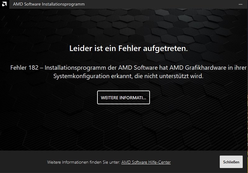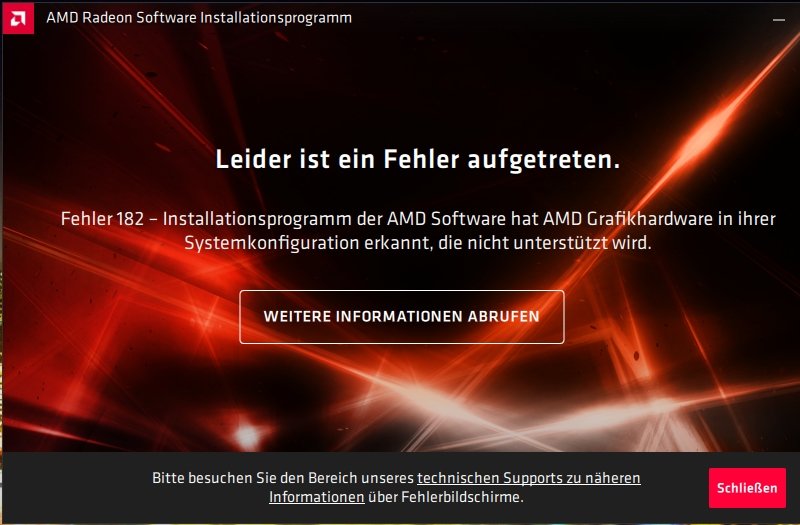 ich bekomme aber immer Error182 AMD Software Installer detectd AMD graphics hardware in your system configuration that is not supported