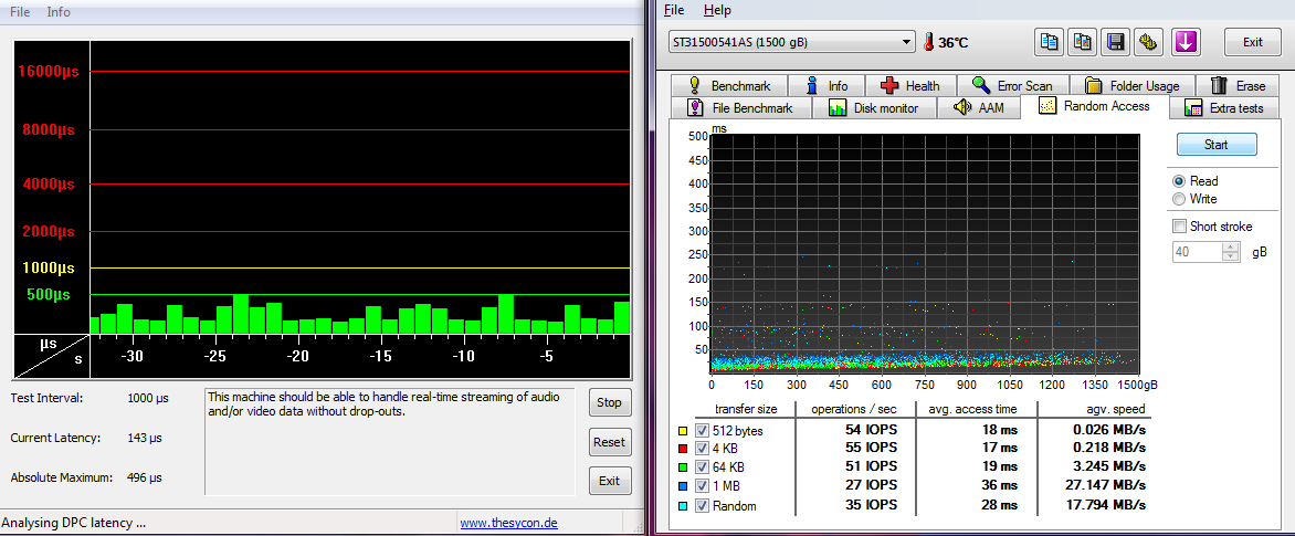 Da ist was ganz anderes faul - wenn man sich die access time-verteilung im read test mit verschiedenen Blockgrößen ansieht, ist ersichtlich, dass manche I/Os eine Verzögerung von 100-150ms, andere 200-250ms haben. Wird auf die Platte noch sonst irgendwie zugegriffen? Wenn nicht, lass mal den "LatencyChecker" laufen, während HDTune läuft.