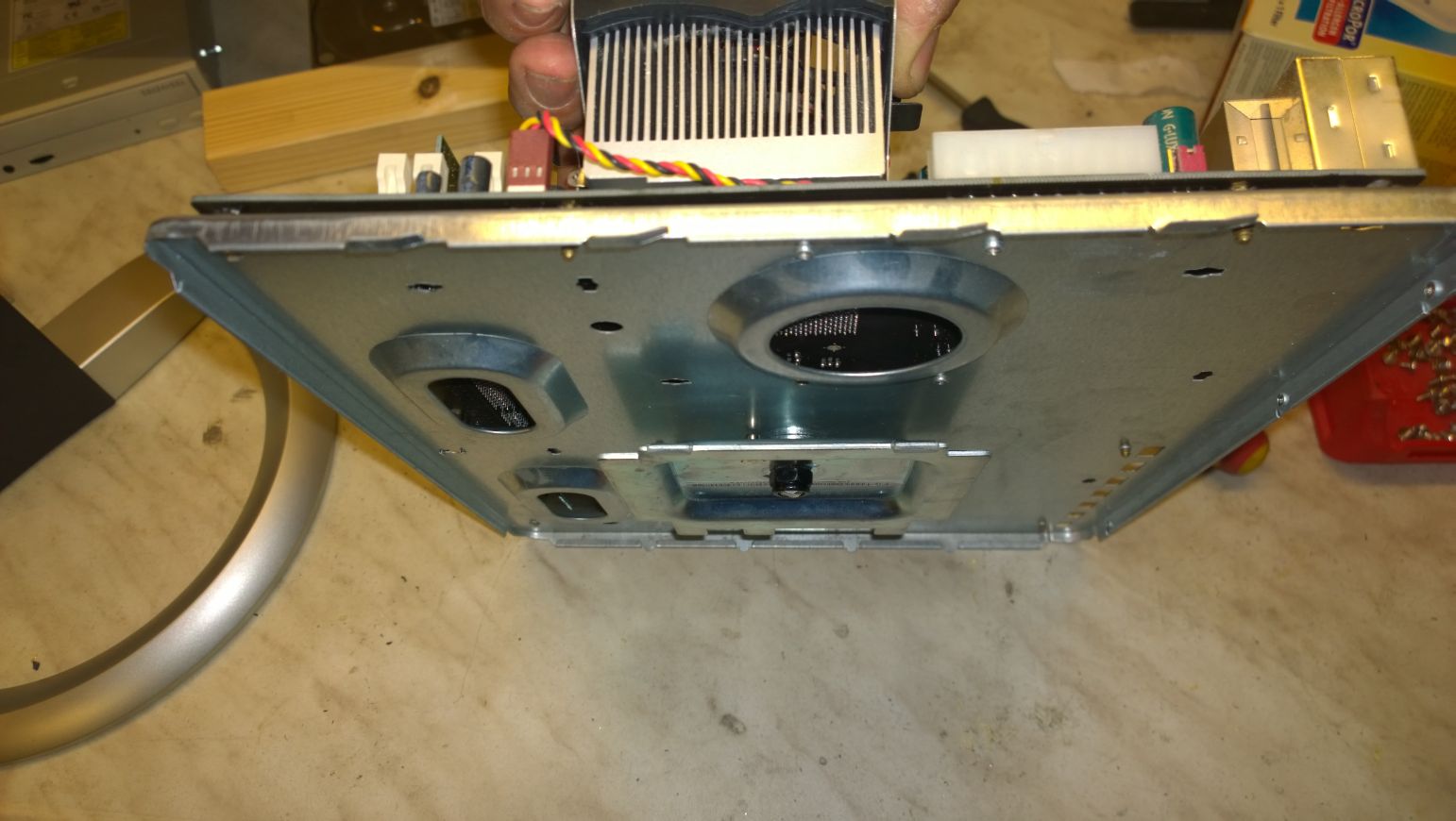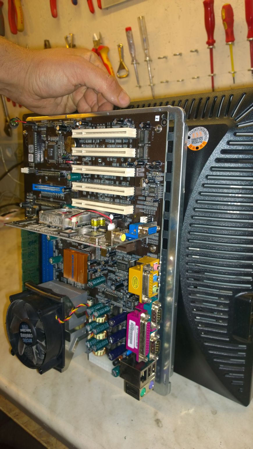 Mainboard mit Träger ausgebaut und hinten am Monitor befestigt - super Idee von mir - mit der halterblatte vom Monitorständer - so kann ich das per Knopfdruck wieder lösen.