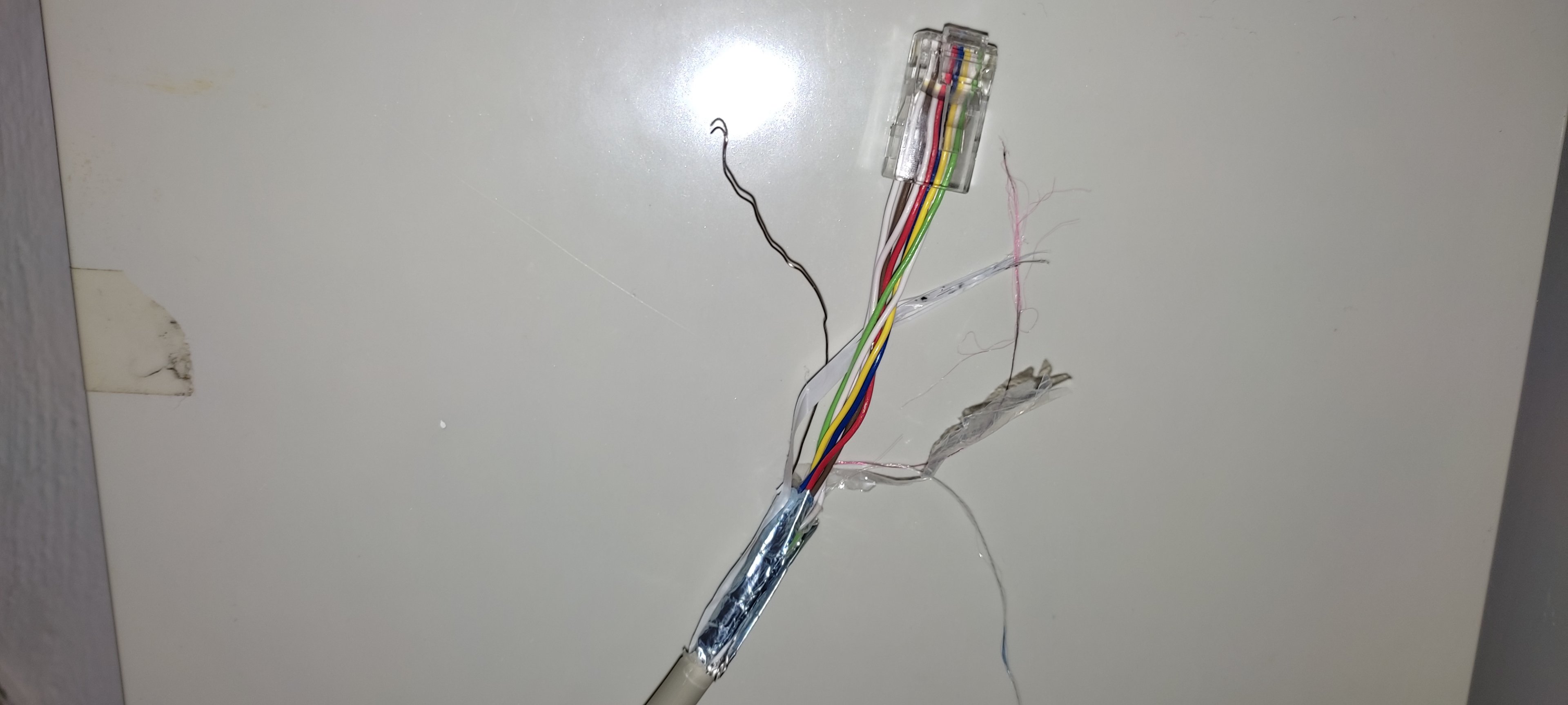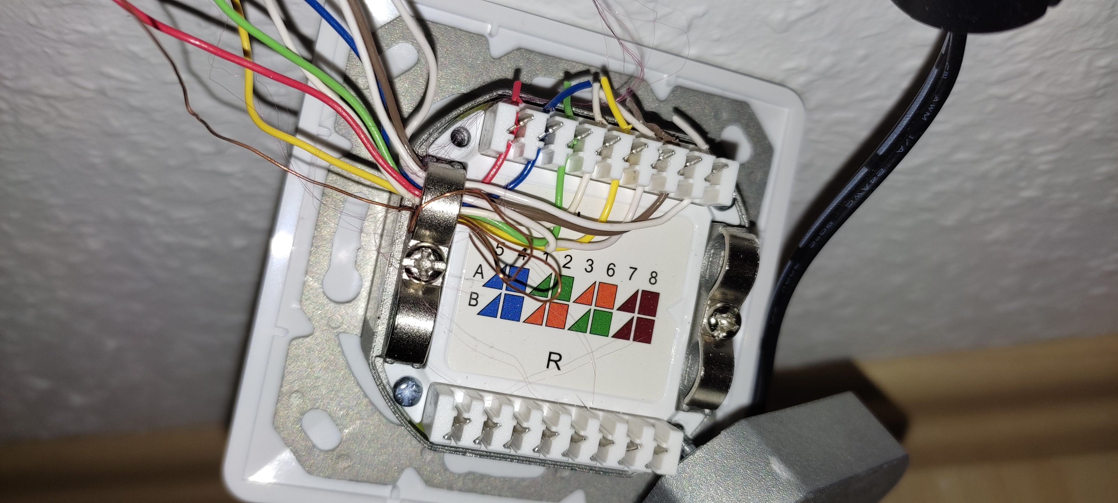 7. Falls nach auflegen der Kabel keine Verbindung zustande kommt müssen die Dosen als Fehlerquelle ausgeschlossen werden. Dies kann man dann in Anlehnung an 1 bis 5 mit jeder einzelnen Dose und einem selbstgebastelten "Adapter" (abgeschnittenes Patchkabel, ein Ende RJ45-Stecker, anderes Ende acht abisolierte Einzeladern) durchführen.