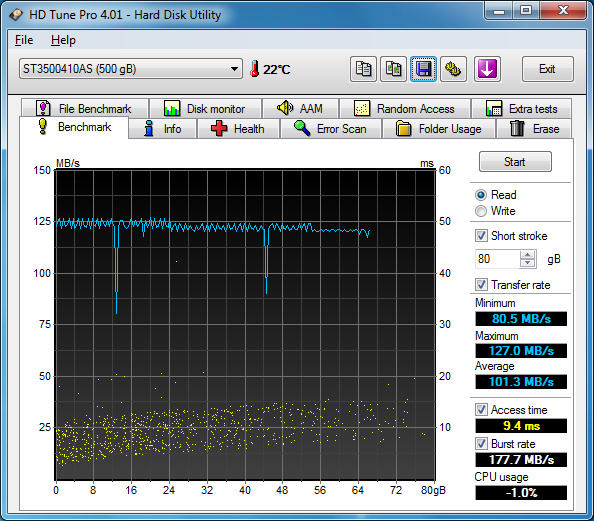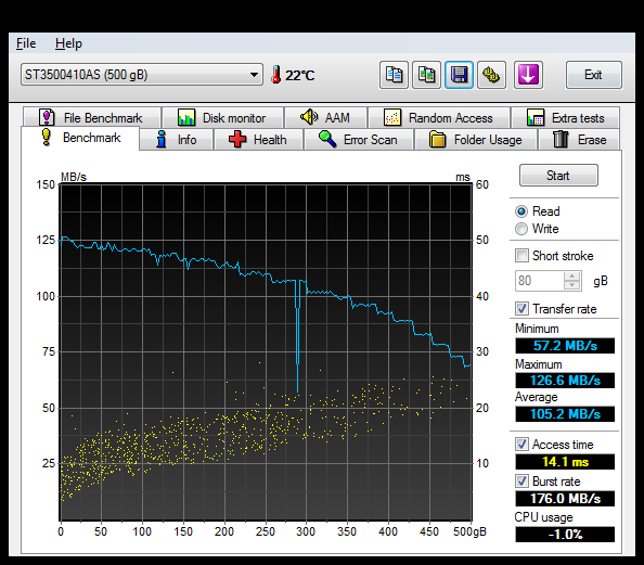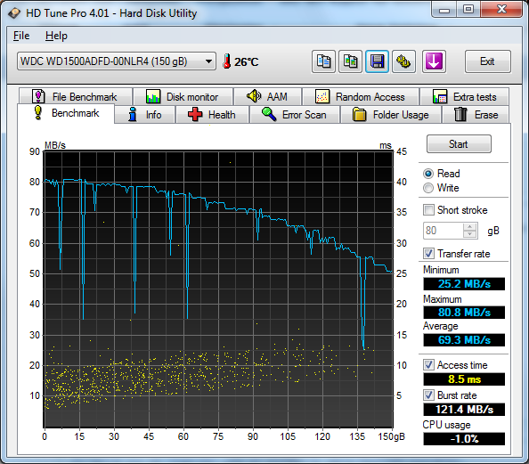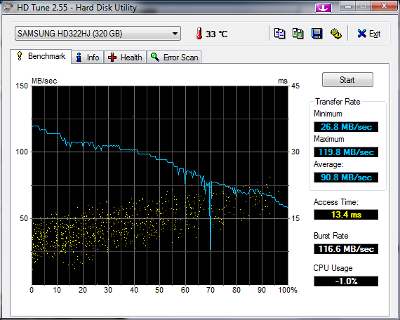 Desweiteren kann HD Tune keine S.M.A.R.T Signal auslesen, aber bei einem Errorscan wird keine Fehler angezeigt.