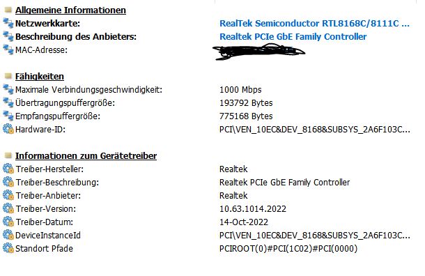 wir haben Glasfaser 500 im Haus. Bei einem uralten Rechner (ca. 10 Jahre alt), der mit Windows 10 läuft, erreiche ich einen minimal schlechtern Ping (10 ms anstatt 8ms) als mit anderen Rechnern im Haus und maximal 250 MBit/s im DL, im UL passt es (115 MBit/s). Liegt das an der Hardware. Konnten Netzwerkkarten vor 10 Jahren noch nicht Geschwindigkeiten von 500 MBit/s erreichen? Anbei ein Screenshot des Netzwerkadapters im Geräte-Manager. Steht GbE nicht für Gigabit?