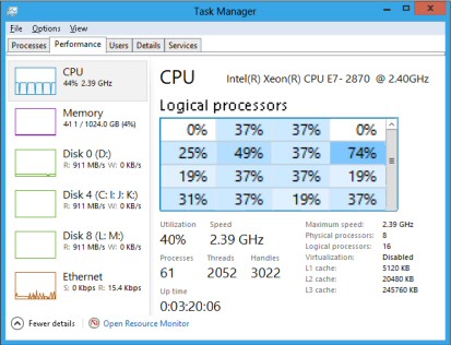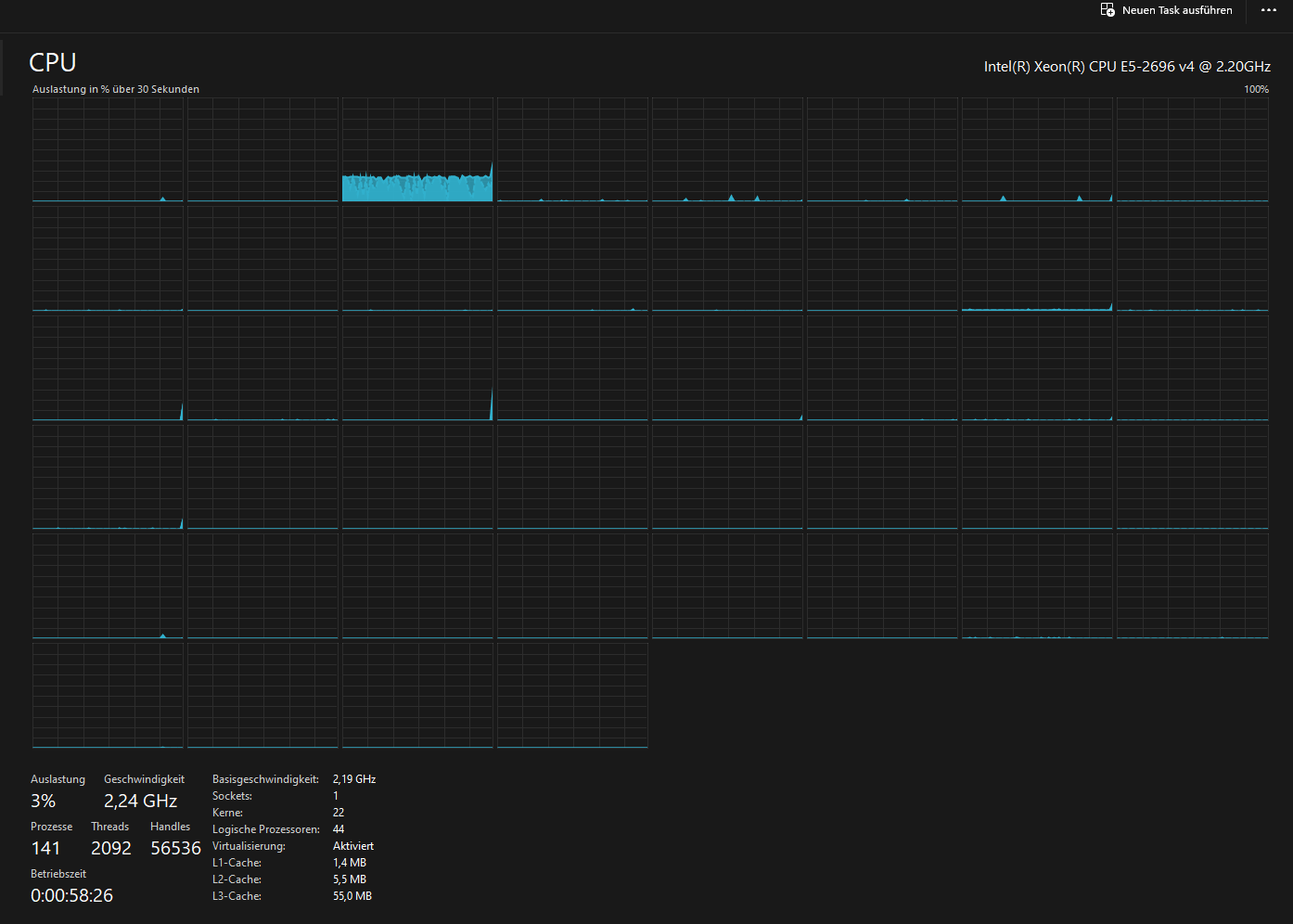 Ich bin auf der Suche nach einer Anzeige, die der CPU Auslastung des Taskmanagers gleicht, aber mit der zusätzlichen Angabe der prozentualen Auslastung jedes Kernes bei den jeweiligen Kernen. HWInfo etc. habe ich alles, suche aber nach eine besseren grafischen Darstellung. Ich meine ich habe das auch schon mal gesehen, aber meine googlesuche führt nicht weiter.