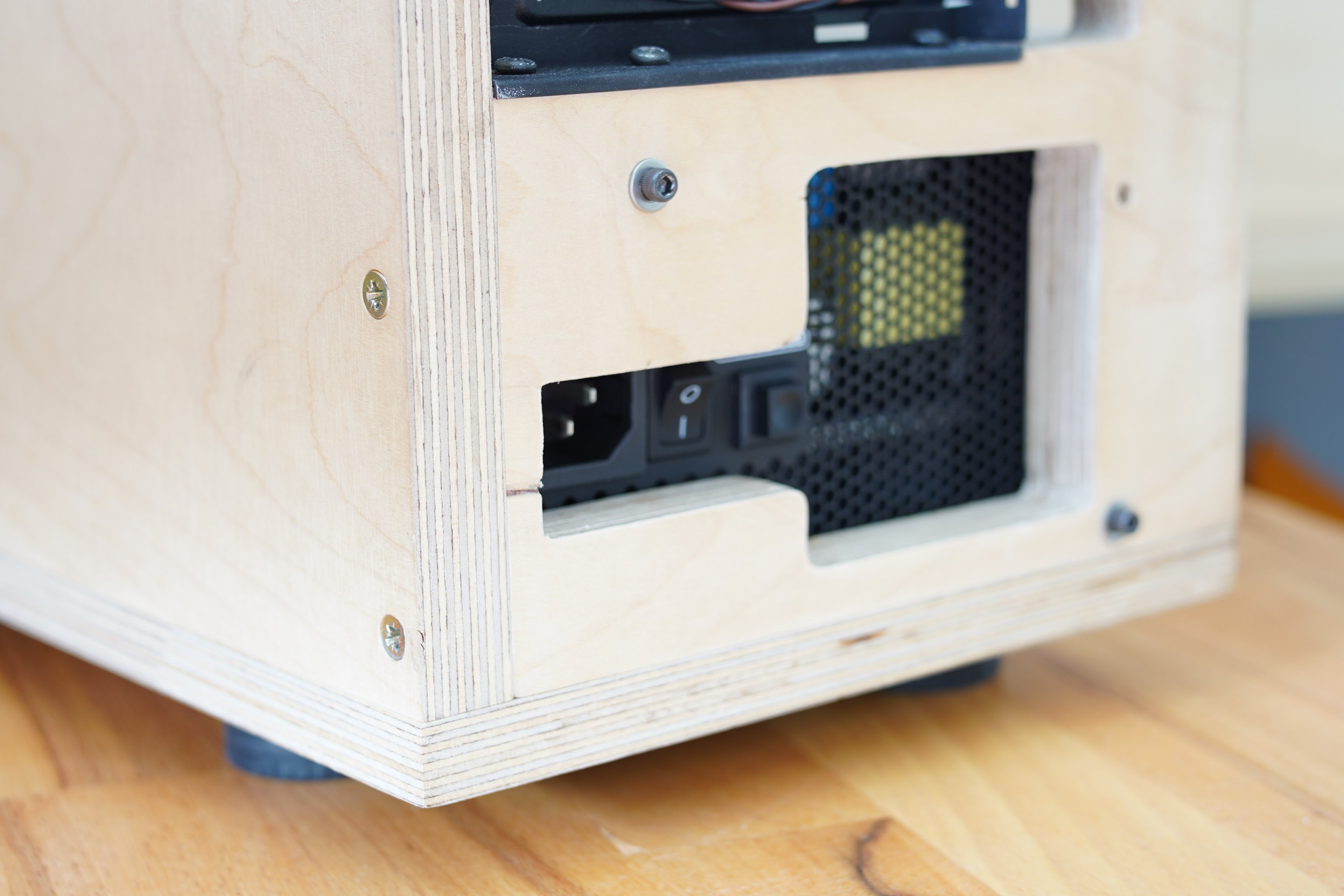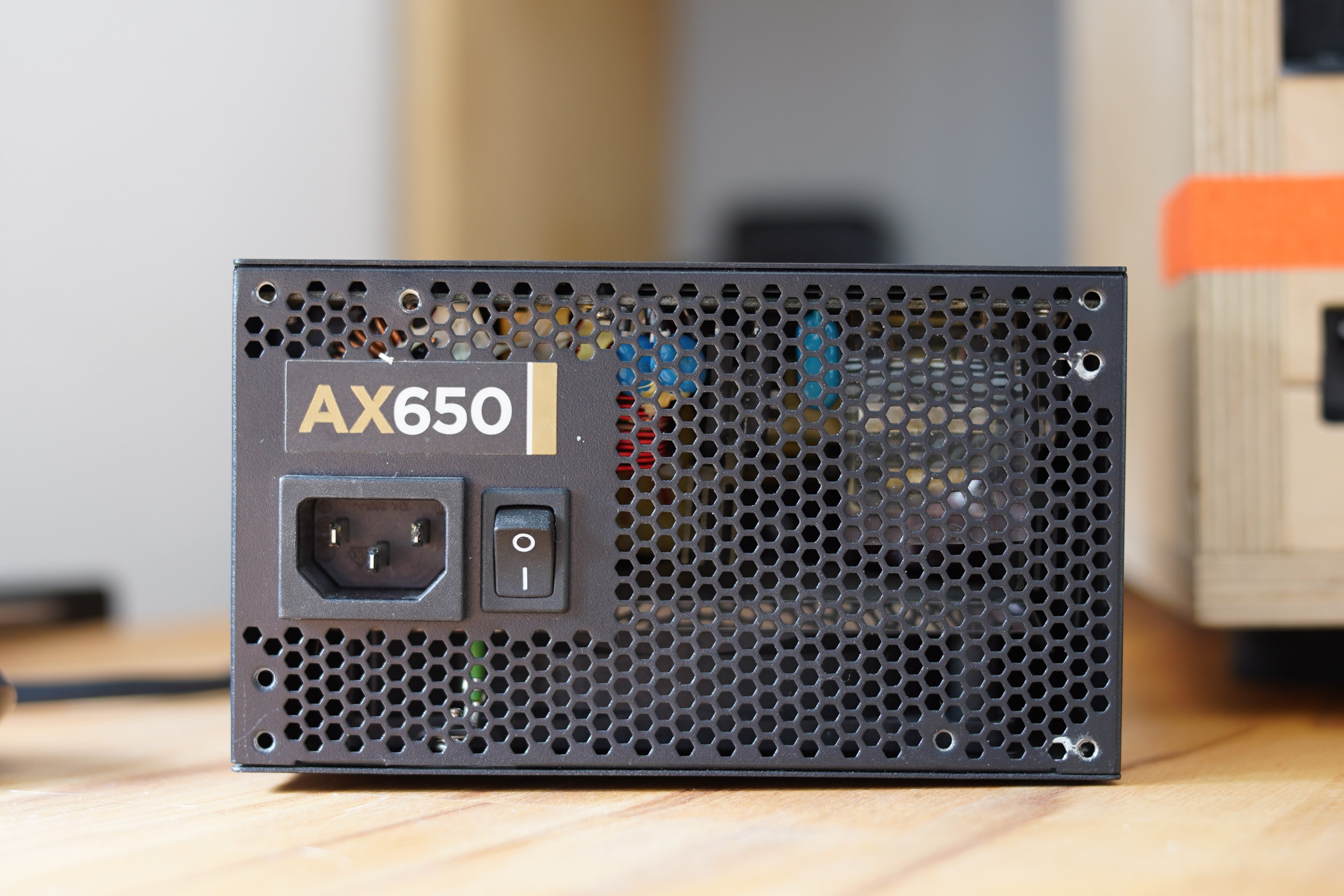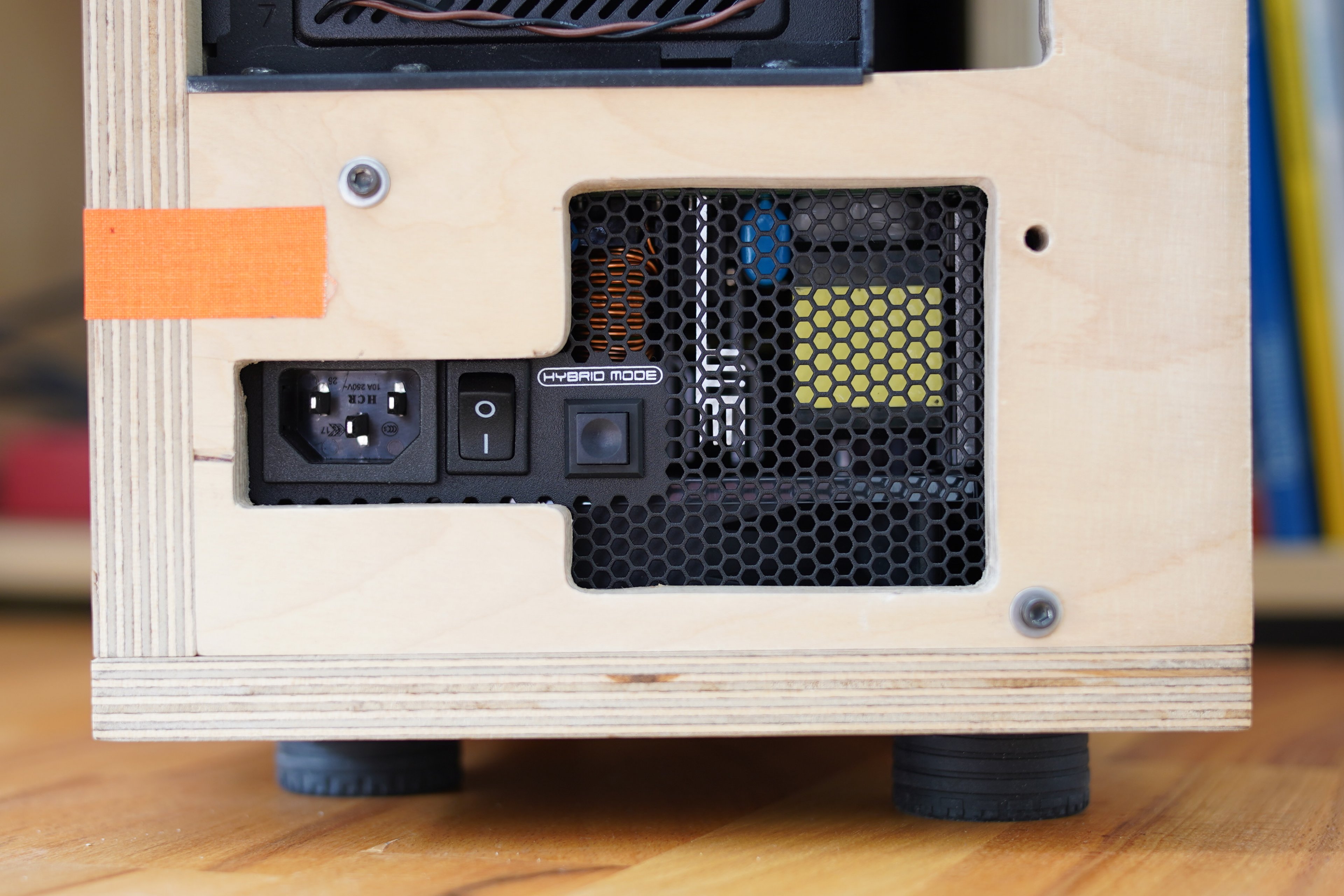 Die Problematik begann damit es zu ersetzten. Mein Gehäuse ist ein Eigenbau und ich habe es damals so kompakt wie möglich gehalten (mit viel Kühlung), weshalb die Aussparung fürs Netzteil sehr spezifisch zum Corsair Ax650 ist und ich kann sie auch nur etwas erweitern, da ich sonst zu nah an eine Schraube komme (orangenes Klebeband zeigt wie weit die Schraube rein ragt und ich habe maximal 160mm tiefe zu Verfügung)