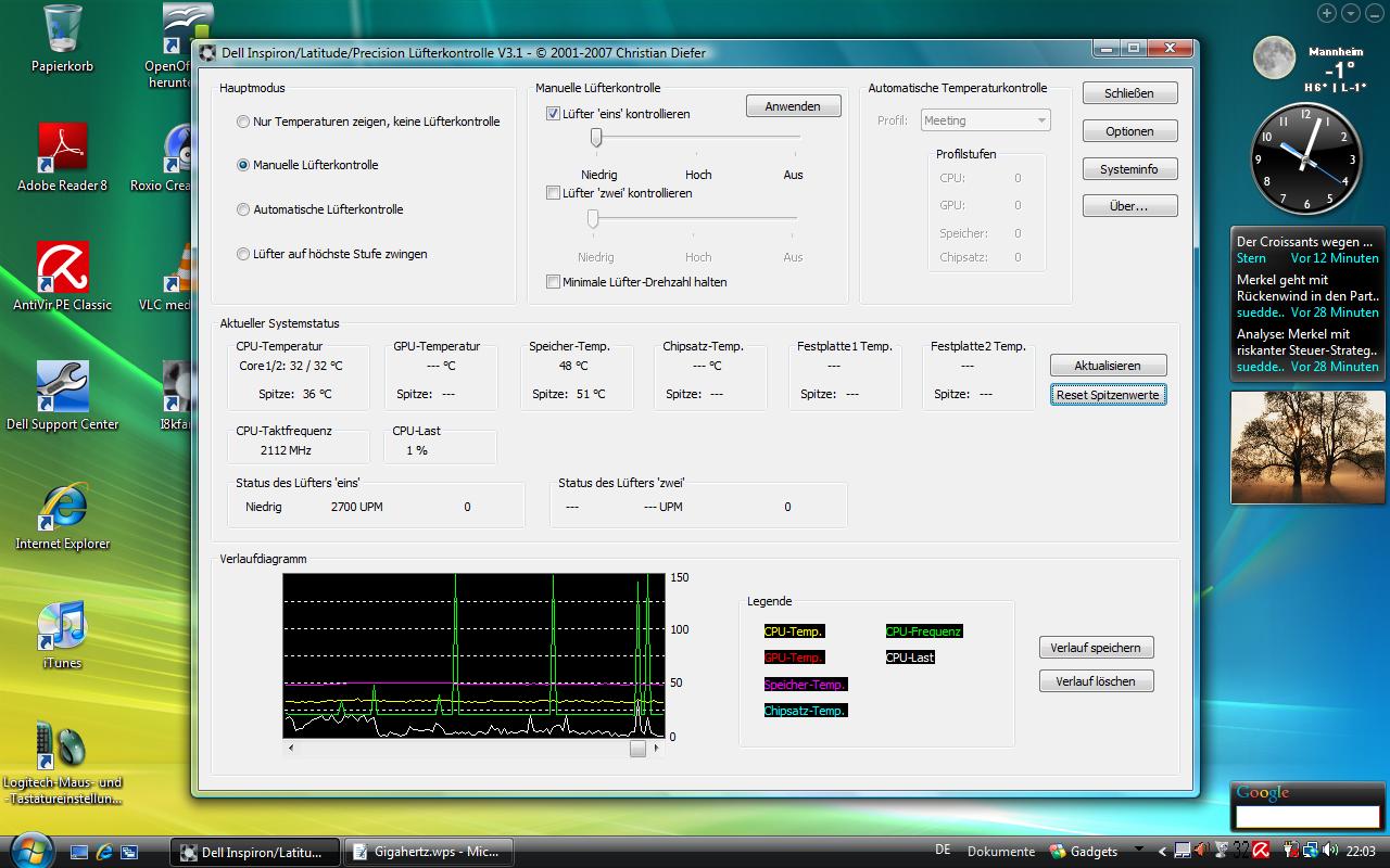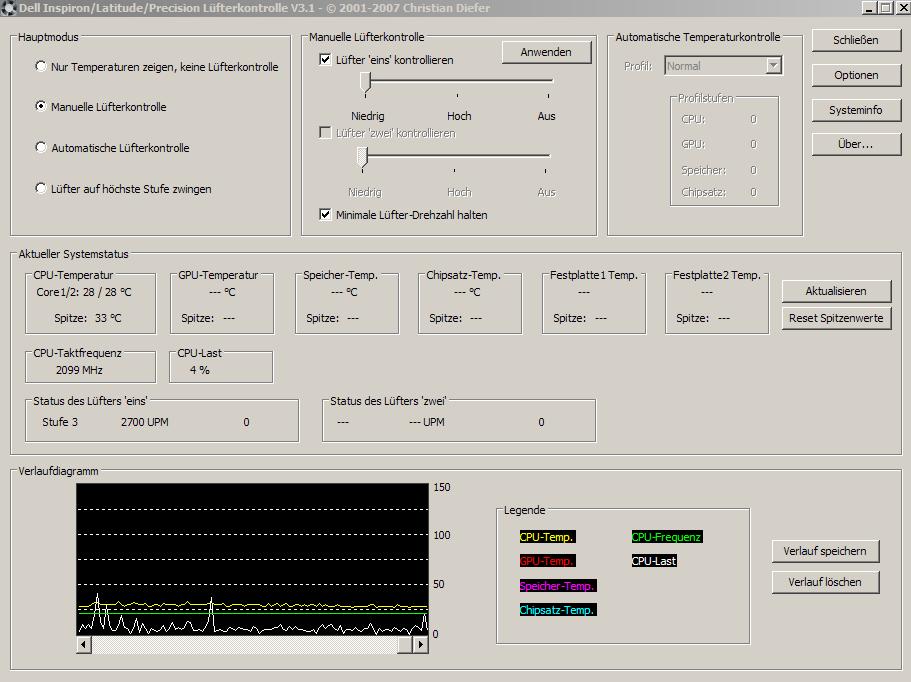Aber jetzt habe ich auf dem Verlaufsdiagramm von I8kfanGUI bei der Linie für die CPU-Frequenz mehrere seltsame Spitzen ausgemacht, die ich mir nicht erklären kann. Ich habe das Ganze mal eine Weile beobachtet; dabei werden ca. 7-fache Werte des normalen Werts, z.B. 15.388 MHz, angezeigt. Es tritt anscheinend immer nur auf, wenn WLan an ist, dann manchmal gehäuft und manchmal gar nicht. Was könnte das sein? Ultra-Overclocking für eine Sekunde? Oder liegt es daran, dass das Programm nicht für den Vostro geschrieben wurde? Hat jemand von euch das auch?