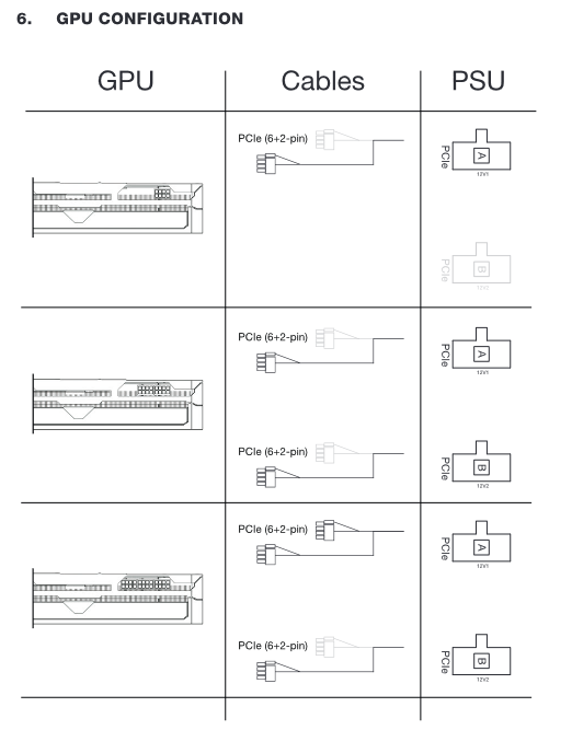 Hier hast du drei Anschlüsse und drei Kabel für die Grafikkarte und zwei Anschlüsse und zwei Kabel für die CPU.