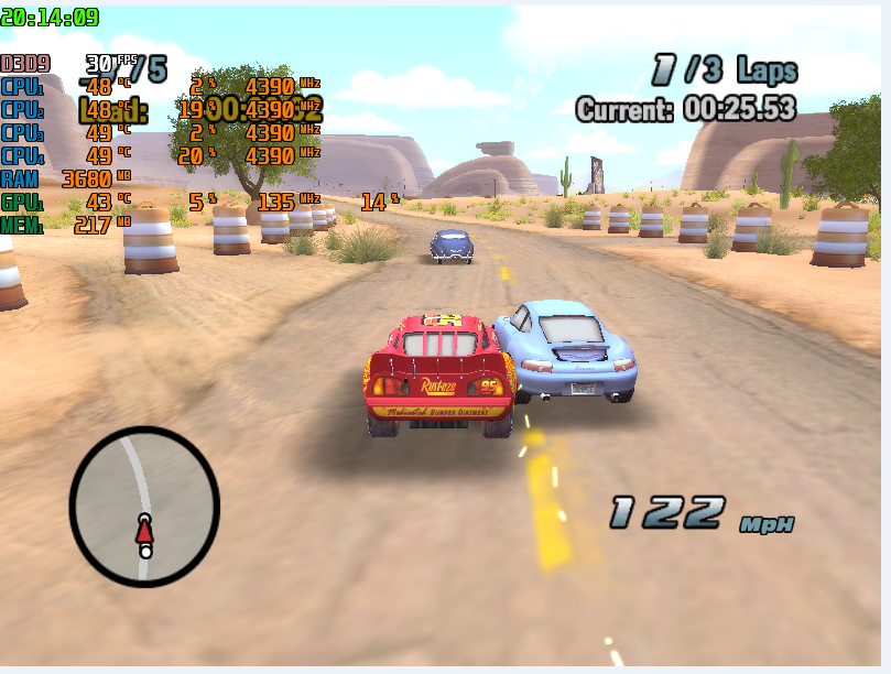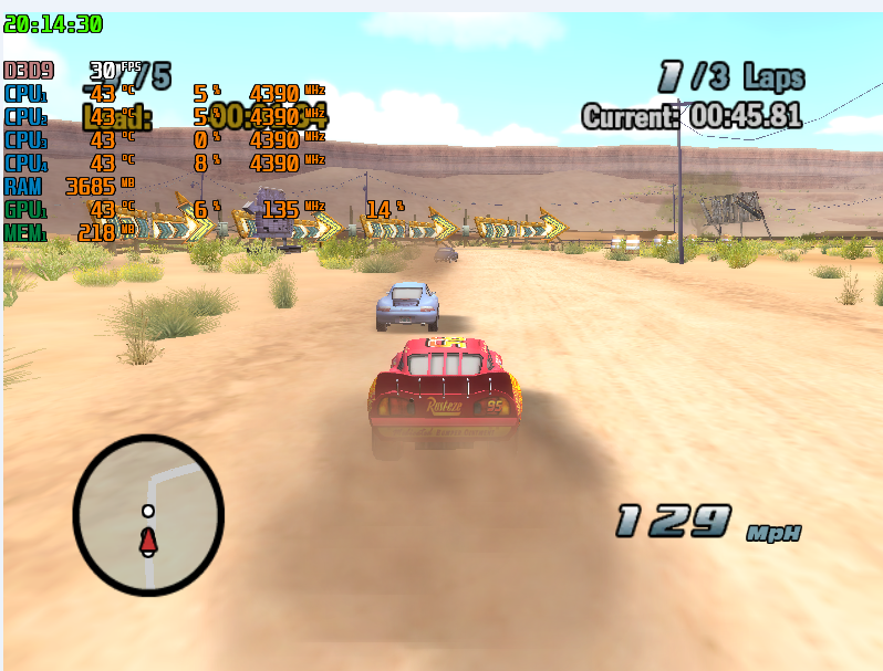 Bei dem alten Spiel CARS ruckelt alles rhythmisch, es ist kein flüssiges Spielen möglich. Die Frame Rate liegt bei 18, die CPU Auslastung bei 100 Prozent und die GPU Auslastung bei etwa 6 Prozent.