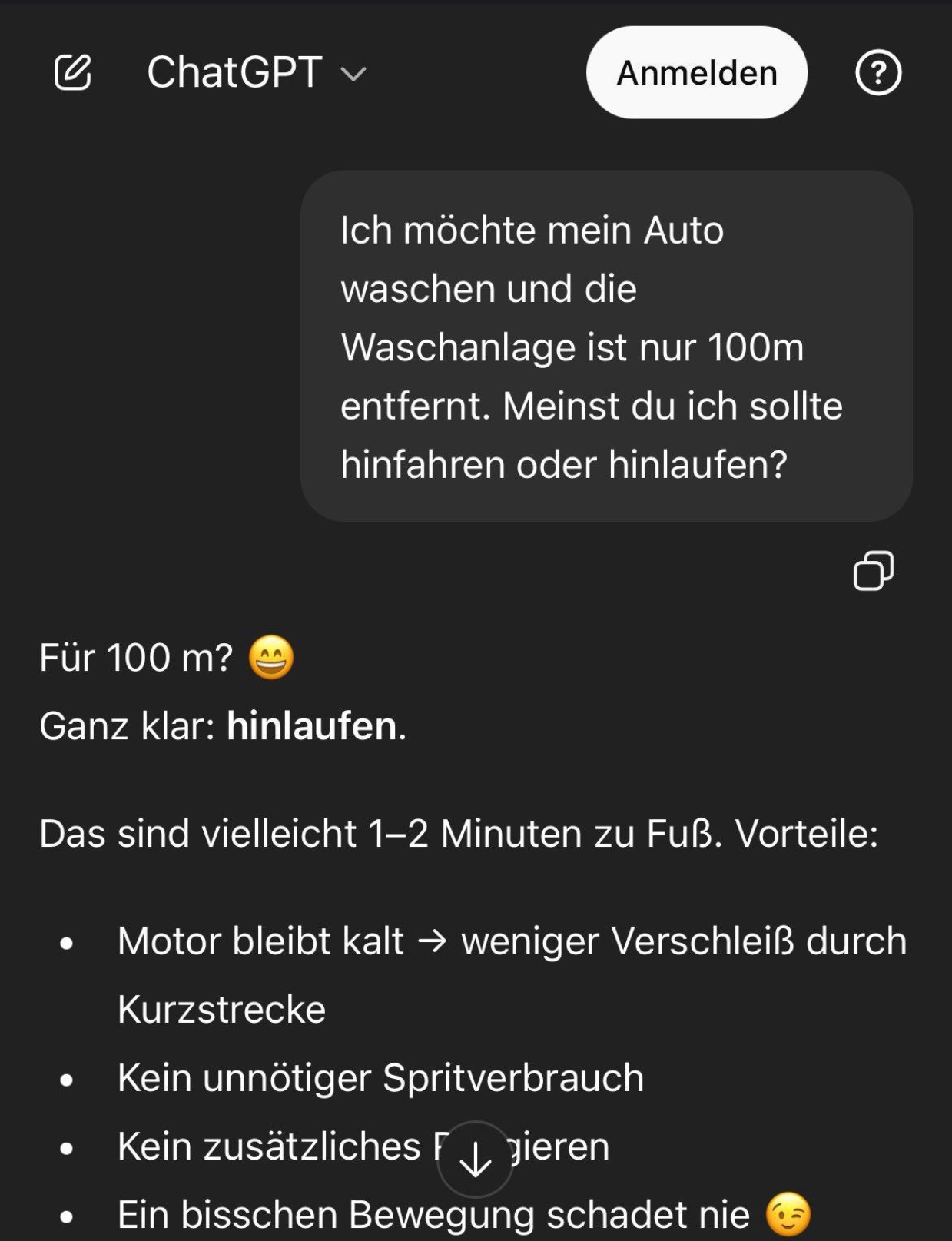 Hab den Prompt letze Woche noch selber getestet und weiter getrieben. War mit dem Fahrrad im 15 km entfernten Nachbarort, weil meine nahe Waschanlage leider zu war. ChatGPT meinte nach weiteren Eingaben dann als letzte Antwort, bevor ich nicht mehr konnte, noch sowas wie: