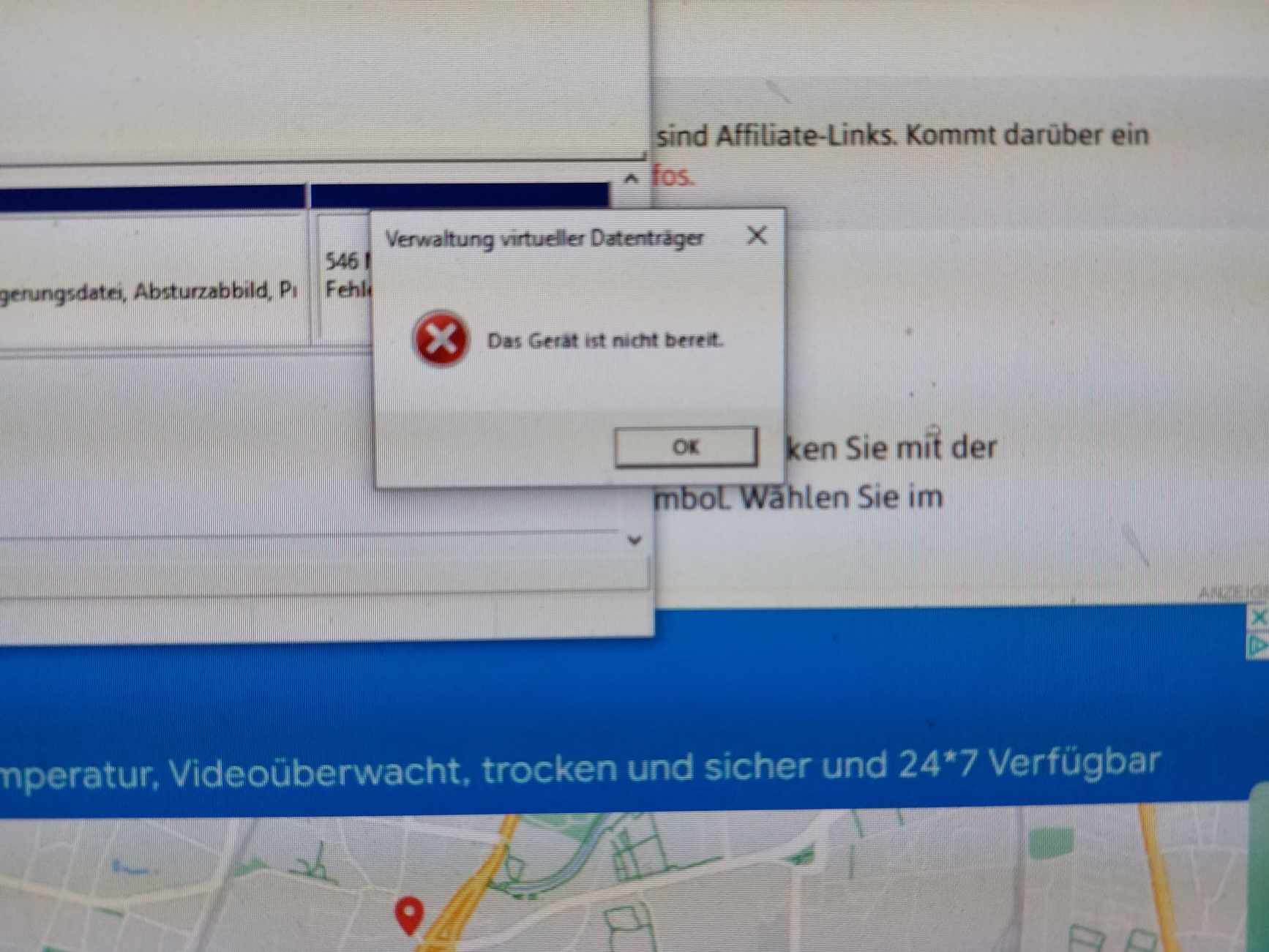 Dann die Datenträgerverwaltung geöffnet - dort wurde die HDD als "Datenträger 2 - unbekannt - nicht initialisiert" angezeigt. Somit mal im Kontextmenü auf "initialisieren" geklickt - dazu die Meldung "Gerät nicht bereit".