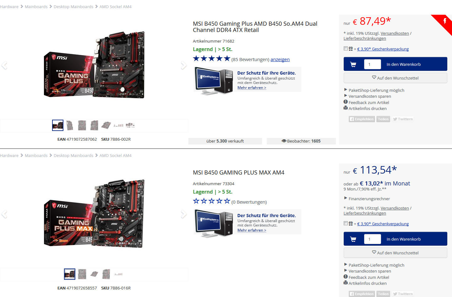 Artikel-Update: Die vom deutschen Support zur Verfügbarkeit der Max-Modelle getroffene Aussage „frühestens im September“ war offensichtlich nicht korrekt: Ab sofort sind mit dem MSI B450 Tomahawk Max sowie dem MSI B450 Gaming Plus Max die ersten beiden Platinen der neuen Serie im deutschen Online-Handel verfügbar. Beim Tomahawk nehmen sich beide Varianten im Preis nichts, beim Gaming Plus kostet die neue Max-Version aktuell noch 20 Euro mehr.
