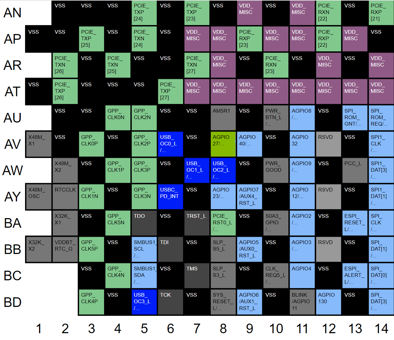 Wenn ich das richtig sehe, müsste es der gelb markierte PIN "AGPIO27/AUX3_RST_L" auf Position "AV/8" sein.