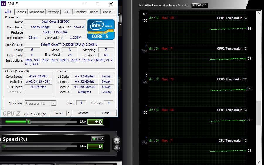 ich laufe nun bei 4.2 gHz und Raum auf 1600er stabil!! FREU!!!... Komme dennoch bei Grafikkarte und CPU Auslastung auf 68 Grad. Denke aber das hält sich noch im Rahmen. Würde glaube ich auch nicht mehr machen wollen, da ich denke wenn ich mir 2 silent Wings 3 kaufe könnte es besser werden und dann könnte ich nochmal so 100 bis 200 MHz rausholen.