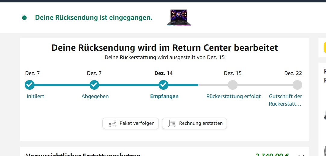 Retourniere ungern Ware, aber in diesem Fall war mir das Geld für die Kompromisse die ich eingehe, einfach zu schade um darüber hinwegzusehen. Also habe ich einen Tag später, am 7ten Dezember, eine Rückabwicklung bei Amazon eingeleitet.