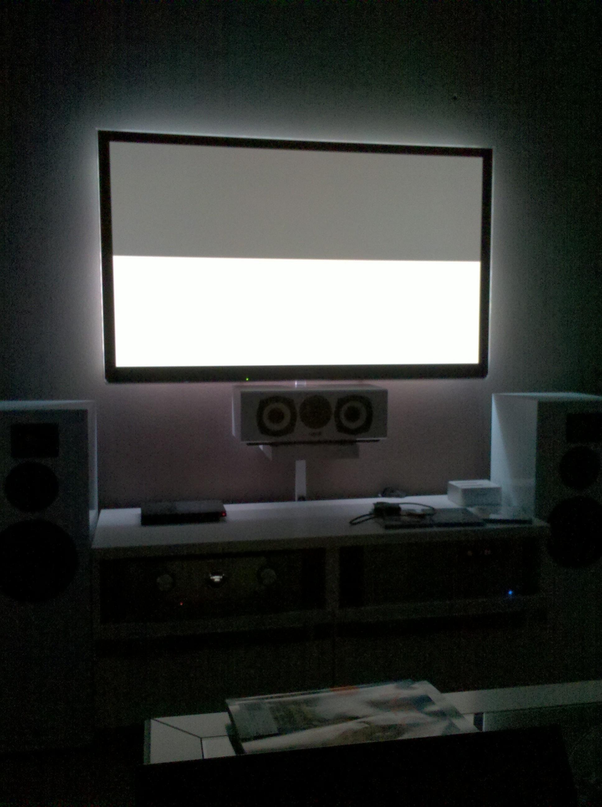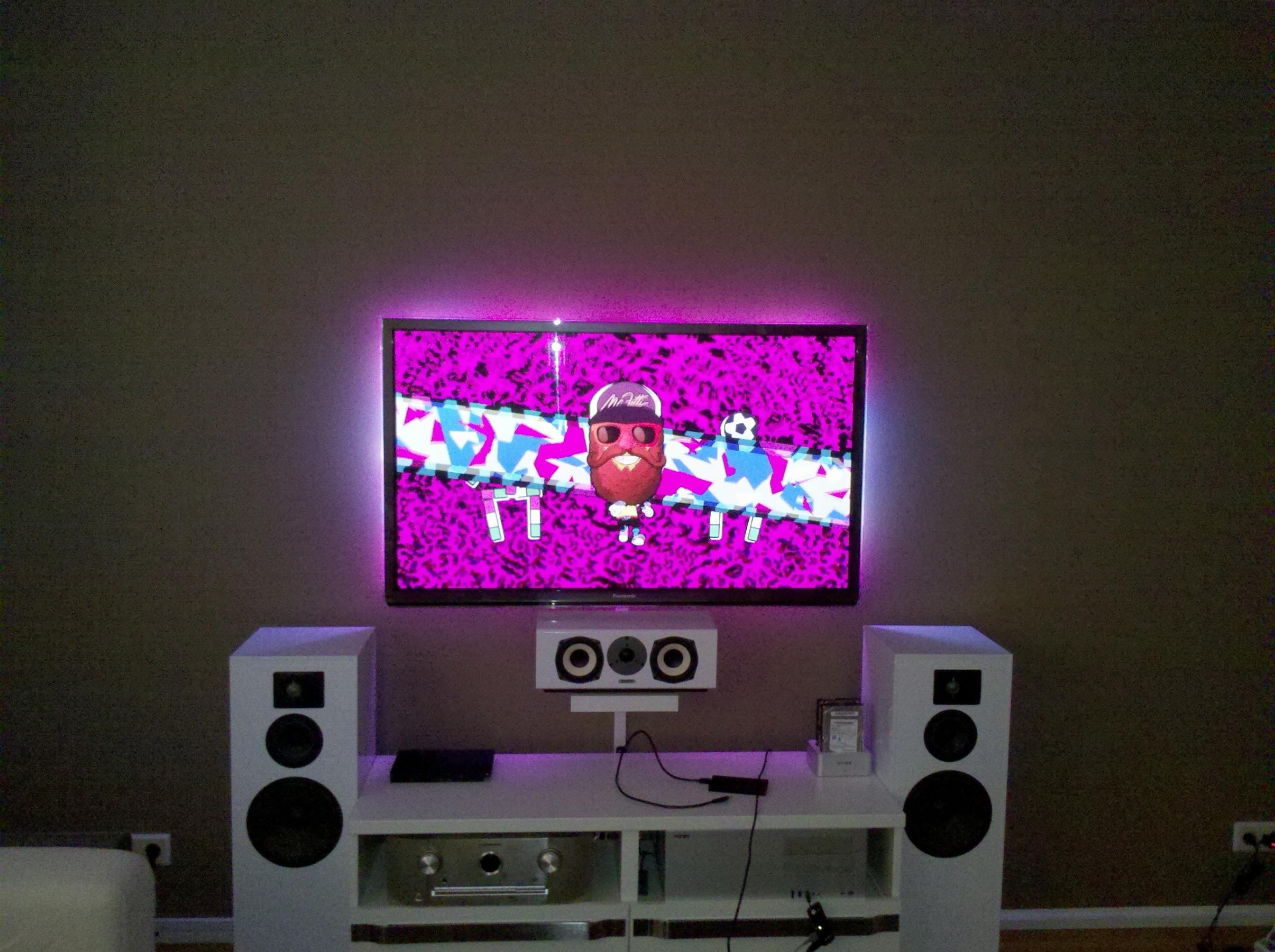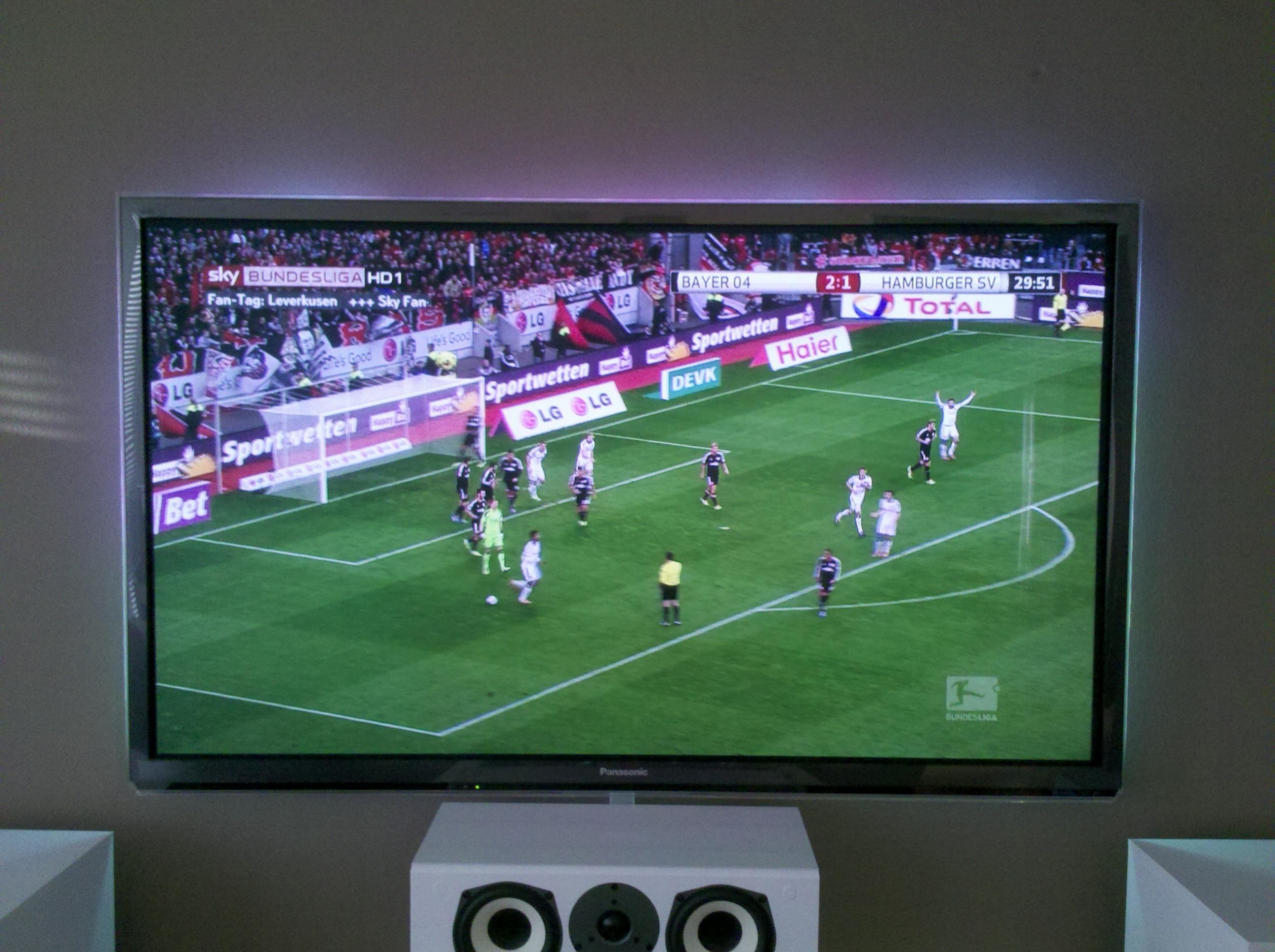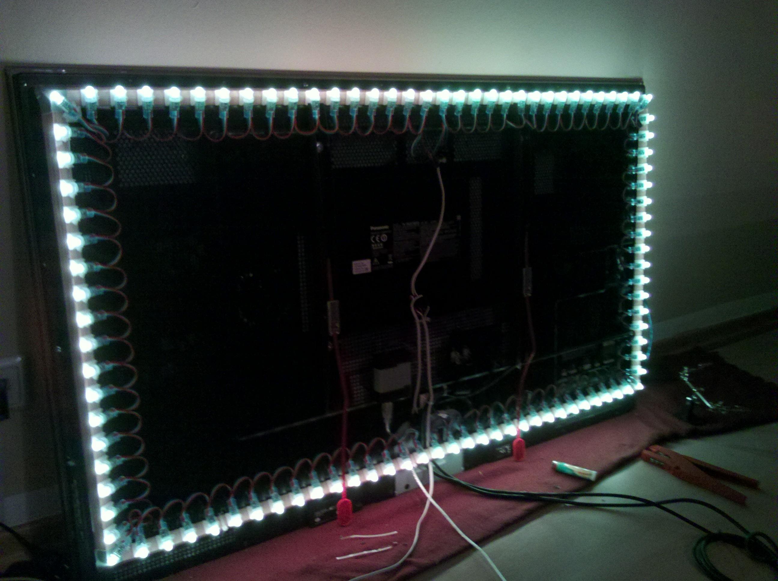 - Im Internet findet man des öfteren Bilder von Usern, die die LEDs mit Klebeband um den TV geklebt haben. Davon rate ich grundsätzlich ab, da die LEDs warm werden und sich die Klebestreifen lösen und/oder die LEDs aus den Schlaufen herausfallen. Am besten man fährt in den Baumarkt und holt sich schmale Holzbretter mit ein paar mm Durchmesser. Das ganze dann passend zusägen, Markieren, Löcher durchbohren und die LEDs mit Kabelbinder festzurren. (Lässt sich mit ner kleinen Handsäge und nem Akkubohrer an einem Abend erledigen)