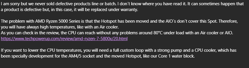 Ja man muss da dann auch alle Werte mit angeben. Mit "meine CPU wird 85°C heiß" kann halt niemand was mit anfangen und dann kommen halt nur Allgemeinplätze wie "ist alles normal" zurück. Welche CPU? Wieviel Kerne wurden belastet? Wie hoch war die Package Power? Ohne solche Angaben sind CPU-Temperatur Angaben vollkommen wertlos. Wenn du denen nicht schreibst, dass du 80°C im Idle hast, gehen die halt von Last aus. Und selbst "Last" ist viel zu unspezifisch heutztage. Ich kann meinen 16-Kerner belasten und hab nur ~50°C oder ich kann ihn belasten und hab 90°C Temperatur-Cap. Alles nur eine Frage der Last (und der Verteilung) :>.PixelMensch schrieb:Ich habe Alphacool angeschrieben und die haben mir gesagt, dass die Werte normal sind x) Würde am Prozessor selbst liegen und ich solle mir keine Sorgen machen...