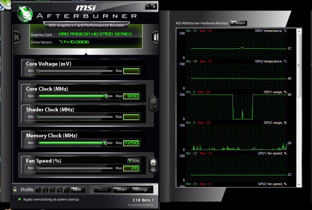 habe mein 6950 auf 6970 geflasht, aber mit msi afterburn kann ich denn gpu und memory nicht auf 6970 takten.