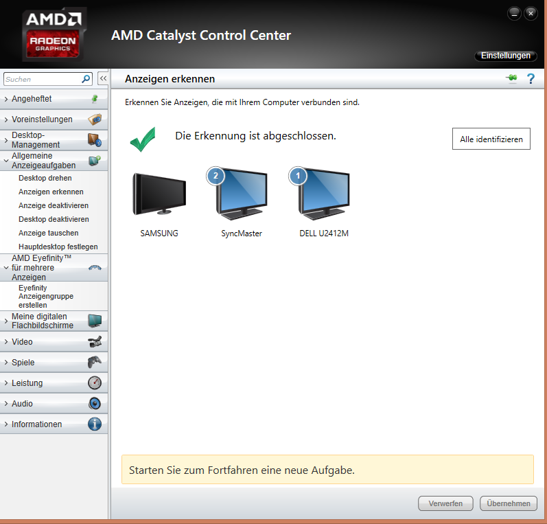 Nun habe ich den Syncmaster per MiniDP angeschlossen und der Samsung (Fernseher) per HDMI. Sie werden auch wie gewollt erkannt, aber sage ich "Identifizieren" kommt nur die 3 auf meinem Dell Bildschirm.