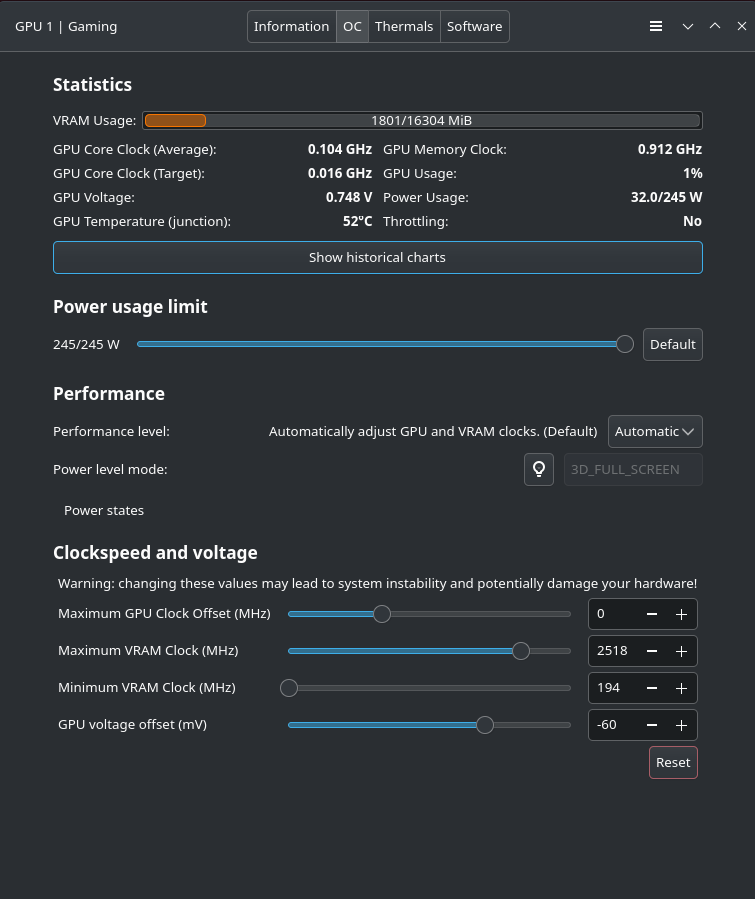 Zum "Tunen" habe ich das Tool "LACT" verwendet, die Adrenalin Software gibt es (afaik) nicht für Linux.