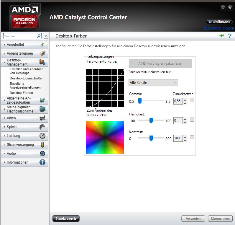 Wie ich sicherlich schon geschrieben habe, weiß ich sehr wohl, dass es in den neuen Treibern u.a. einen Helligkeitsregler gibt (unter Anzeige -> Farbe). Dieser entspricht aber nicht dem alten Gamma-Regler, sondern vermutlich einfach dem alten Helligkeitsregler. Einen Gamma-Regler, der wie im alten CCC eine Farbkorrekturkurve beeinflusst, konnte ich bis heute nicht finden und es ist mir bei meinen Versuchen nicht gelungen, diese Funktion durch Nutzen der neuen Regler nachzubilden.