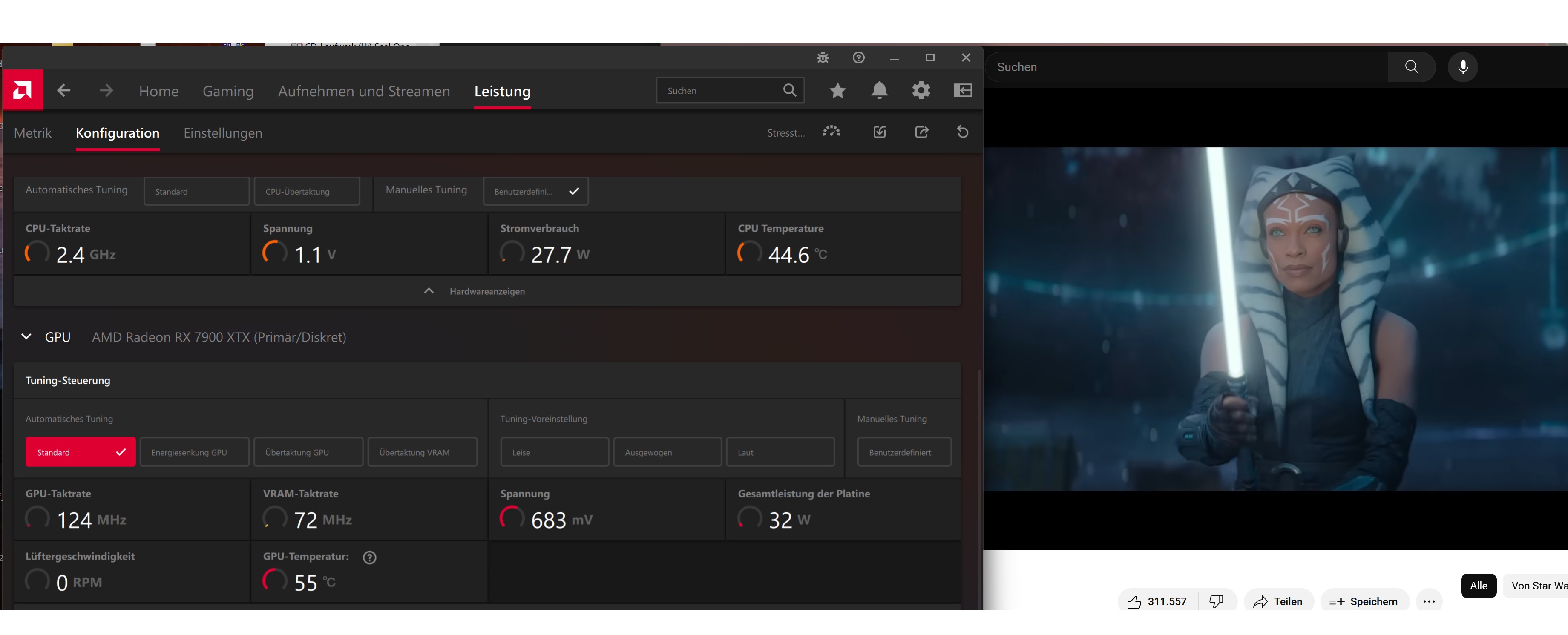 Da haben wir bei der 7900XTX bei Youtube +41W, beim zocken ohne FPS Limit +31W (mit 144FPS Limit sogar +51W).